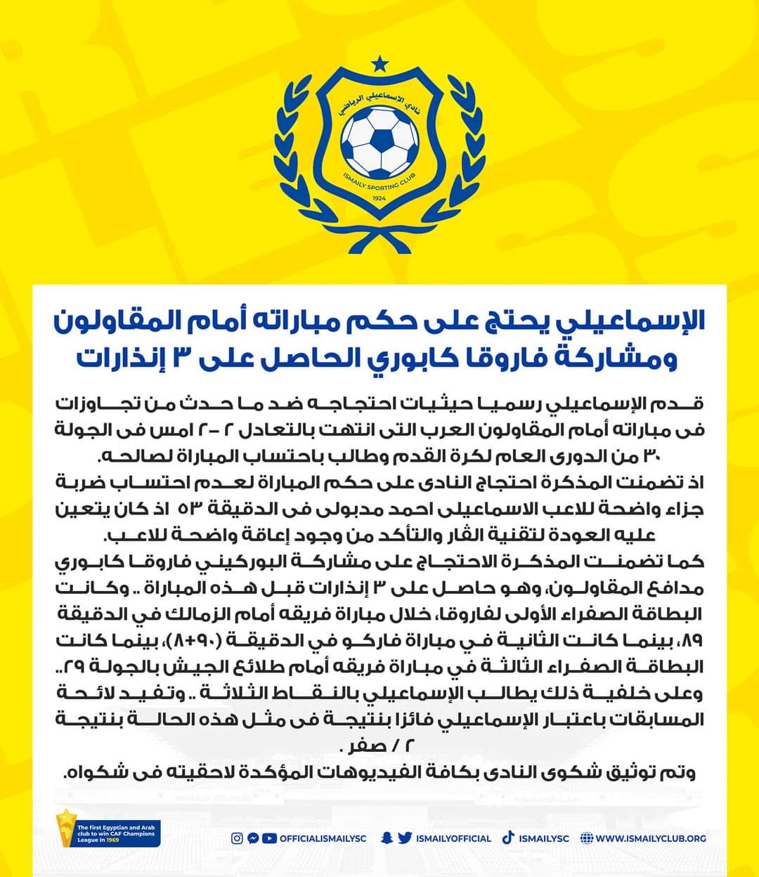 وأكد الإسماعيلى في بيان رسمي توثيق شكوى يكشف فيها حيثيات ما حدث في مباراة المقاولون العرب، ويطالب بالنقاط الثلاثة.