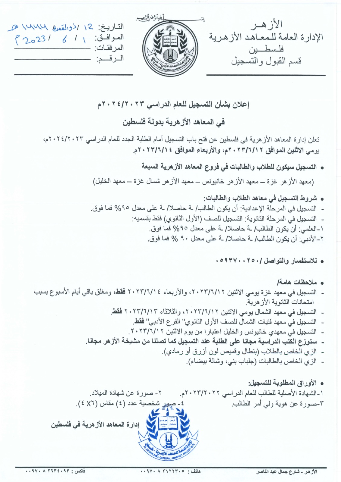 أعلنت إدارة المعاهد الأزهرية في فلسطين عن فتح باب التسجيل أمام الطلبة الجدد للعام الدراسي 2023/2024م، يومي الاثنين الموافق 12/6/2023م، والأربعاء الموافق 14/6/2023م.
