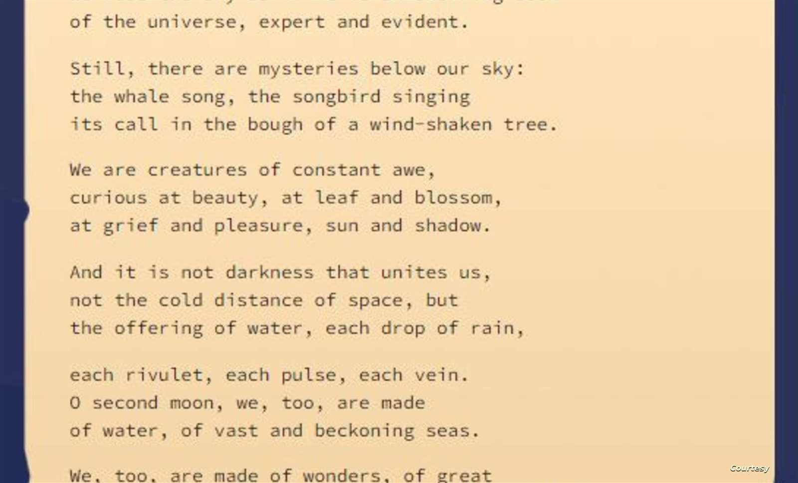 وأضافت "ليس الظلام الذي يوحدنا.. ليست المسافة الباردة في الفضاء، ولكن قربان الماء في كل قطرة مطر.. أيها القمر الثاني.. نحن أيضا خلقنا من المياه والبحار الشاسعة والغريبة".