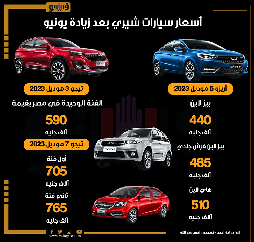 أسعار سيارات شيري بعد زيادة يونيو (انفوجراف) الأحد 04/يونيو/2023 - 12:33 م 6/4/2023 12:33:03 PM سيارات آية أحمد شارك طباعة 18 حجم الخط شارك طباعة اسعار سيارات شيرى اسعار سيارات شيري اريزو سيارات شيري