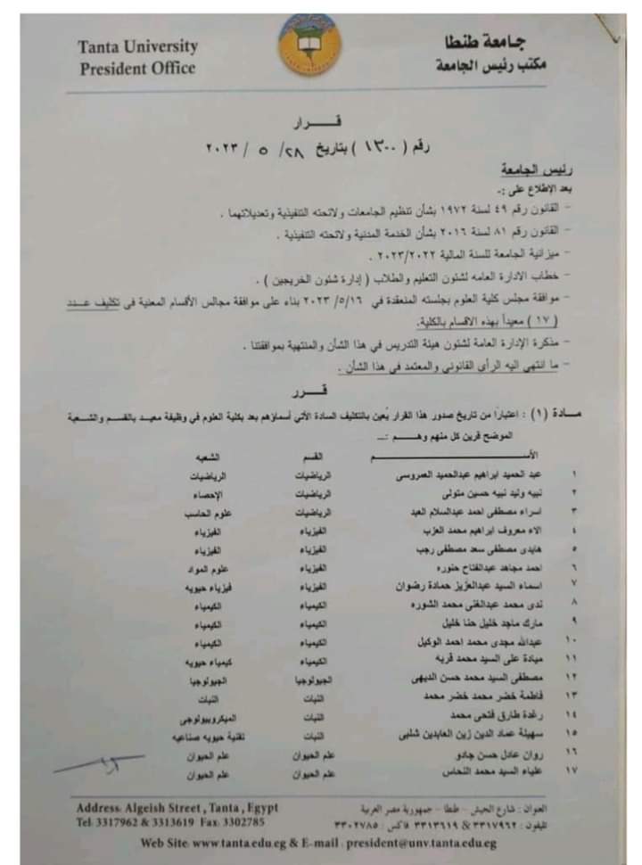 وأصدر الدكتور محمود ذكي رئيس جامعة طنطا قرارًا بأن يعين بالتكليف كل من المرفق أسماؤهم في وظيفة معيد بالقسم والشعبة الموضح قرين كل منهم بكلية العلوم جامعة طنطا.
