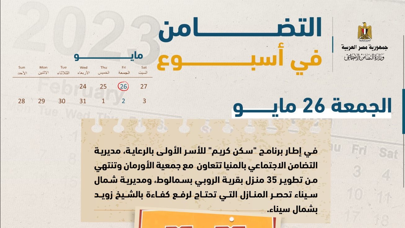 - في إطار برنامج "سكن كريم" للأسر الأولى بالرعاية، مديرية التضامن الاجتماعى بالمنيا تتعاون مع جمعية الأورمان وتنتهى من تطوير 35 منزلًا بقرية الروبى بسمالوط، ومديرية شمال سيناء تحصر المنازل التي تحتاج لرفع كفاءة بالشيخ زويد بشمال سيناء.