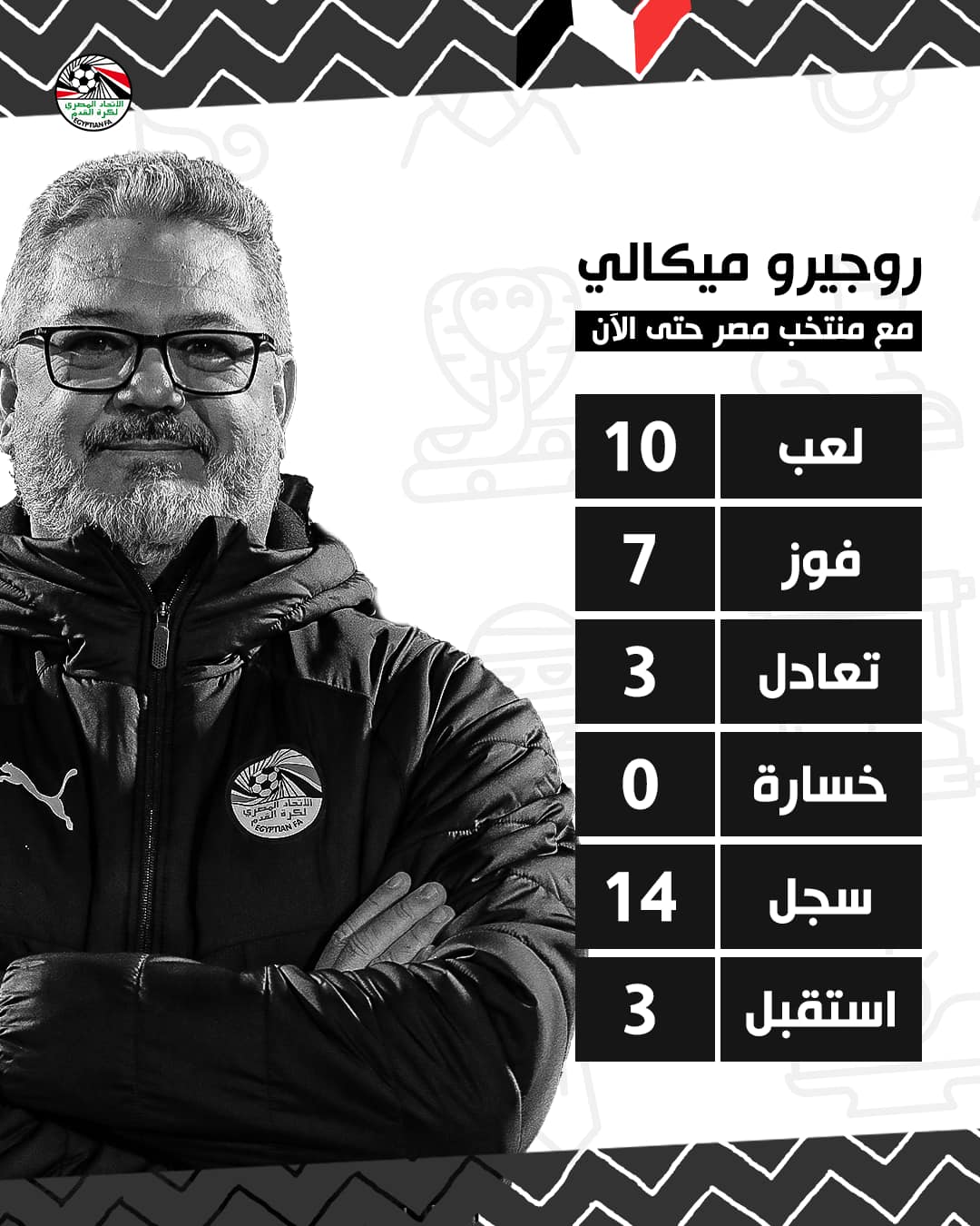 منتخب مصر خاض 10 مباريات فقط تحت قيادة البرازيلي روجيرو ميكالي، ما بين مباريات رسمية وأخرى ودية جاءت نتائجها جيدة، حيث فاز في 7 مباريات وتعادل في ثلاث مباريات ولم يخسر أي مباراة، وسجل 14 هدفا واستقبلت شباكه 3 أهداف.