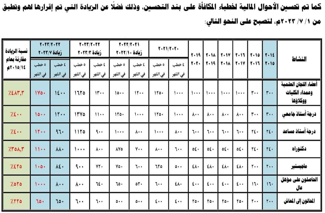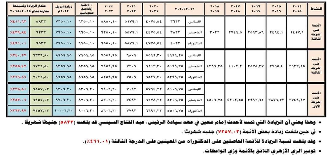 قالت وزارة الأوقاف إنه تم تحسين الأحوال المالية للأئمة خلال العام المالي 2022 / 2023 م بزيادة قدرها (400) جنيه شهريًّا في بدل صعود المنبر من 1/ 3/ 2023 م، فضلًا عن العلاوة المقررة لجميع موظفي الدولة من 1/ 4/ 2023م ؛ لتصبح على النحو التالي: