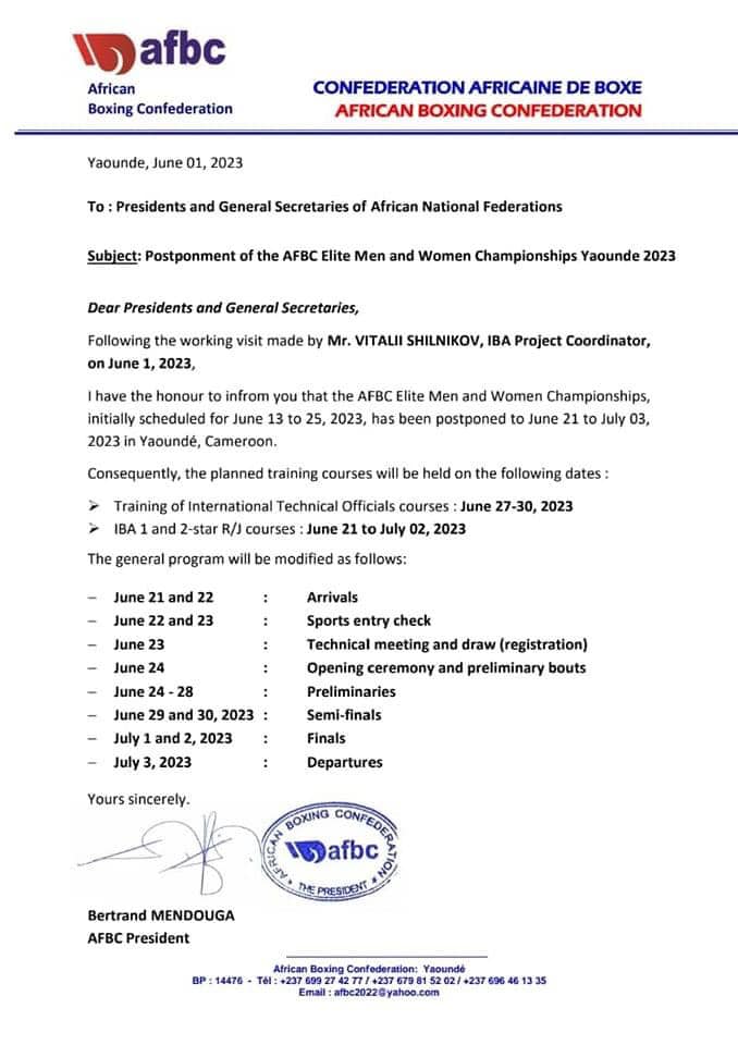 الملاكمة، قرر مسئولو الاتحاد الأفريقي للملاكمة تأجيل منافسات البطولة الأفريقية المقرر إقامتها في الكاميرون بمشاركة عدد كبير من اللاعبين واللاعبات.