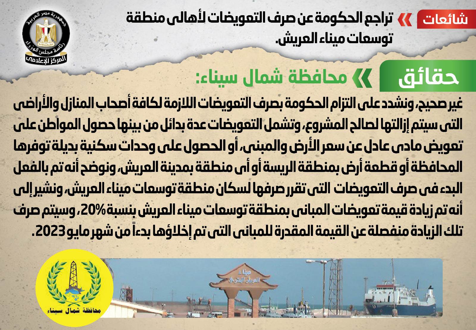 وقد قام المركز الإعلامي لمجلس الوزراء بالتواصل مع محافظة شمال سيناء، والتي نفت تلك الأنباء، مُؤكدةً أنه لا صحة للتراجع عن صرف التعويضات لأهالي منطقة توسعات ميناء العريش، مُشددةً على التزام الحكومة بصرف التعويضات اللازمة لكافة أصحاب المنازل والأراضي التي سيتم إزالتها لصالح المشروع، وتشمل التعويضات عدة بدائل من بينها حصول المواطن على تعويض مادي عادل عن سعر الأرض والمبنى، أو الحصول على وحدات سكنية بديلة توفرها المحافظة أو قطعة أرض بمنطقة الريسة أو أي منطقة بمدينة العريش.