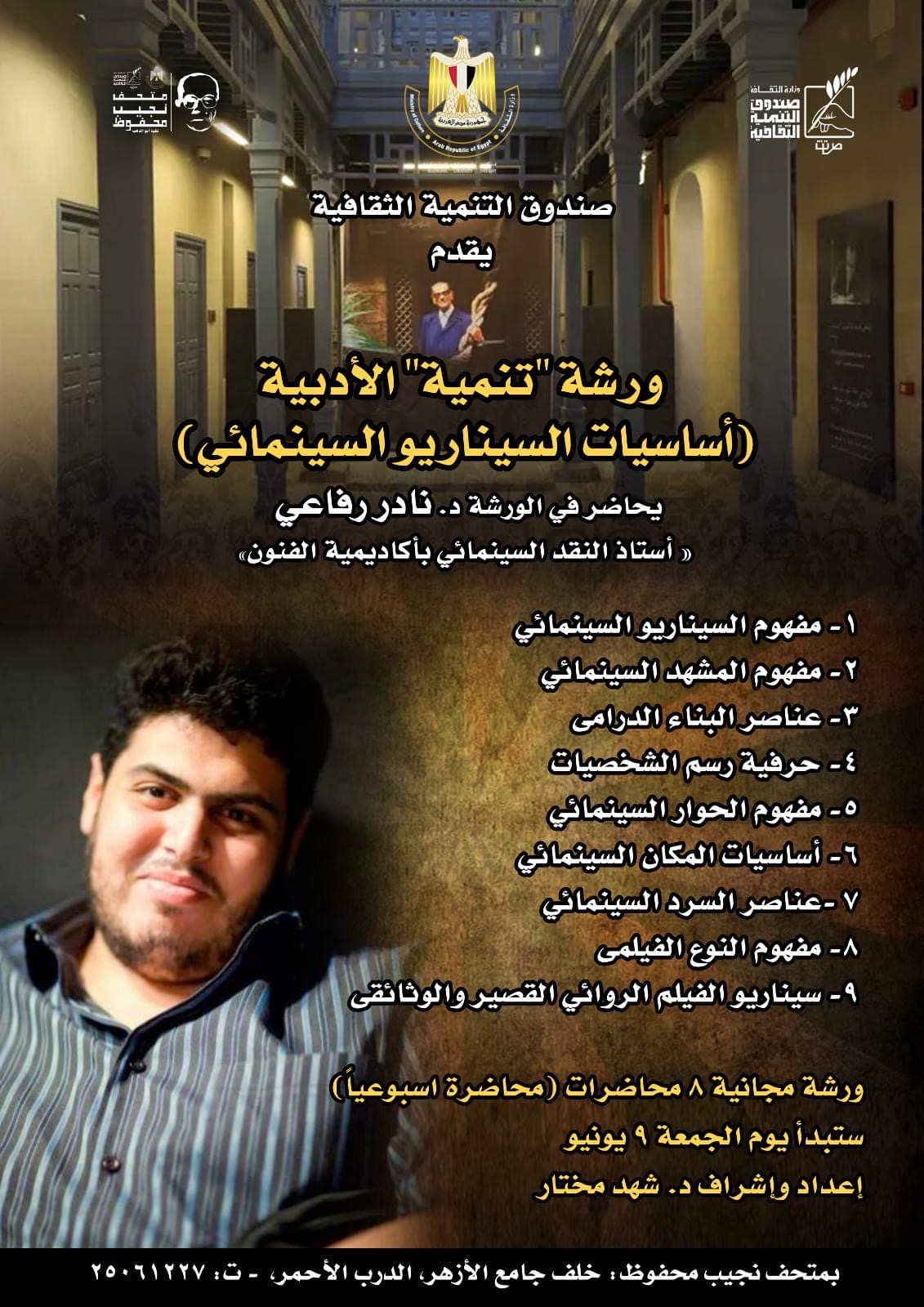 تنطلق في تمام الثالثة عصر يوم الجمعة المقبل الموافق 9 يونيو الجاري، ثاني فعاليات ورشة تنمية بمتحف نجيب محفوظ والتابع لقطاع صندوق التنمية الثقافية، وذلك تحت عنوان "أساسيات السيناريو السينمائى" مجانا للجمهور.