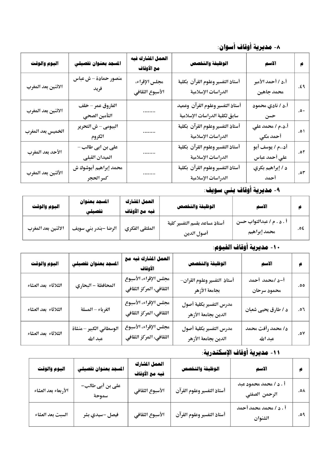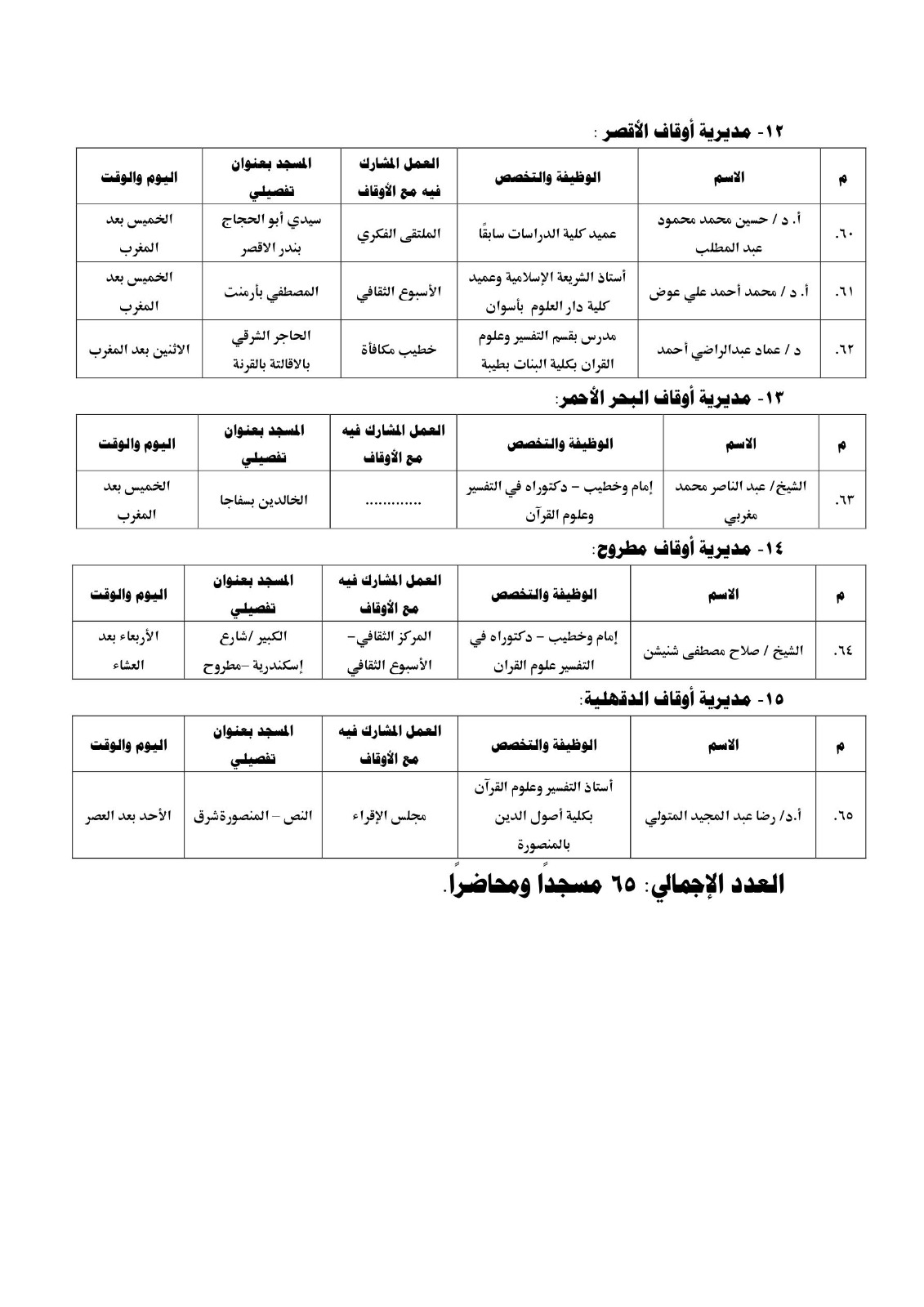 وسيتم إقامة الأسبوع الثقافي بجميع المديريات الإقليمية وعددها ( 27 مديرية)، من خلال المساجد التالية: