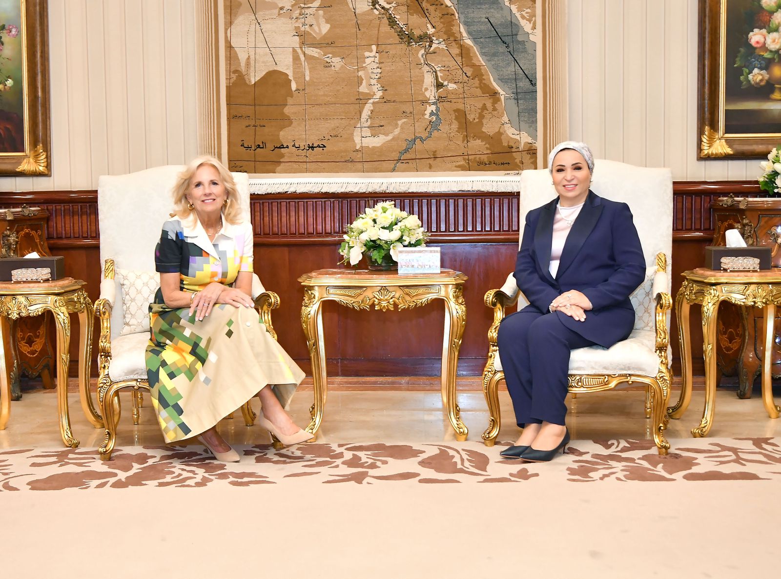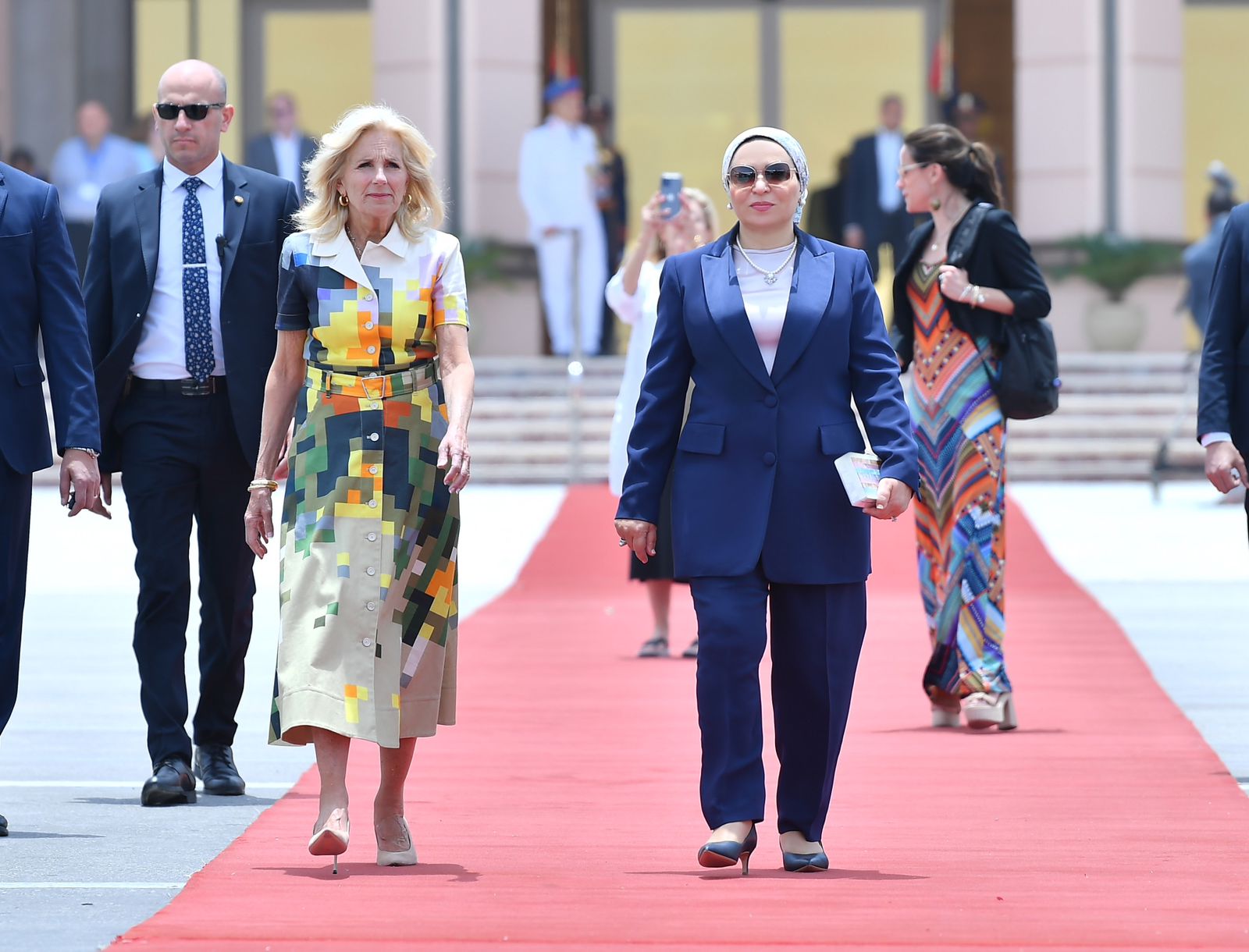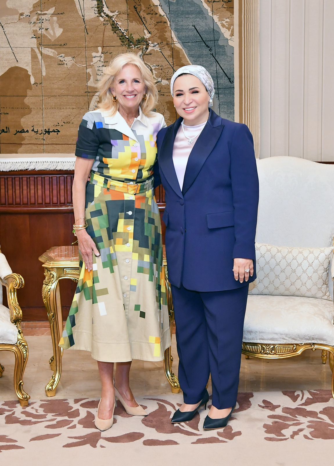 قرينة السيسي تودع جيل بايدن بعد انتهاء زيارتها لمصر (صور)