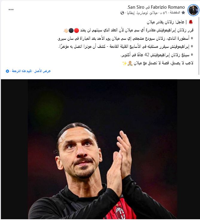 قرر السويدي زلاتان إبراهيموفيتش مغادرة نادي ميلان الإيطالي لأن عقده سينتهي في يونيو الحالي وتم الاتفاق بين النادي واللاعب على عدم التجديد، وسيودع اللاعب السويدي فريقه في مباراة غد الأحد في سان سيرو أمام فيرونا.