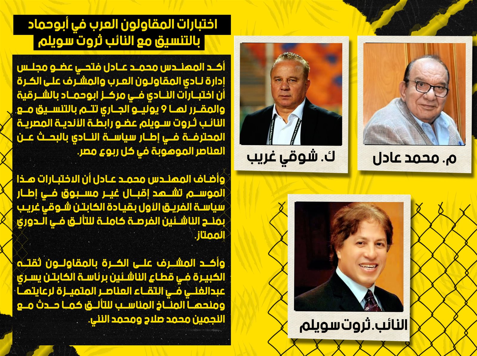 اختبارات الناشئين، أكد المهندس محمد عادل فتحي عضو مجلس إدارة نادي المقاولون العرب والمشرف على الكرة أن اختبارات النادي في مركز أبوحماد بالشرقية، والمقرر لها 9 يونيو الجاري تتم بالتنسيق مع النائب ثروت سويلم عضو رابطة الأندية المصرية المحترفة في إطار سياسة النادي بالبحث عن العناصر الموهوبة في كل ربوع مصر.
