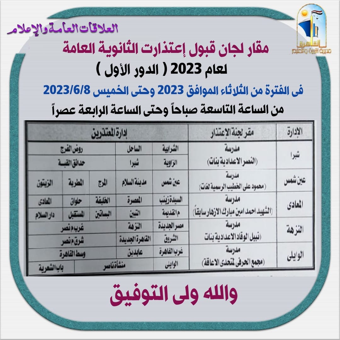 أعلنت مديرية التربية والتعليم بمحافظة القاهرة، عن أماكن مقار لجان قبول اعتذارات الثانوية العامة لعام ٢٠٢٣ ( الدور الأول) فى الفترة من الثلاثاء الموافق ٢٠٢٣/٦/٦ إلى الخميس ٢٠٢٣/٦/٨، وذلك من الساعة التاسعة صباحًا وحتى الساعة الرابعة عصرًا.