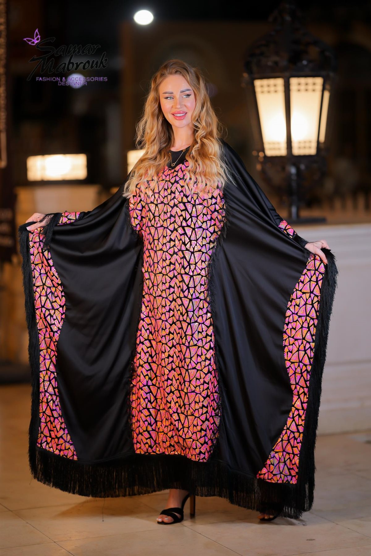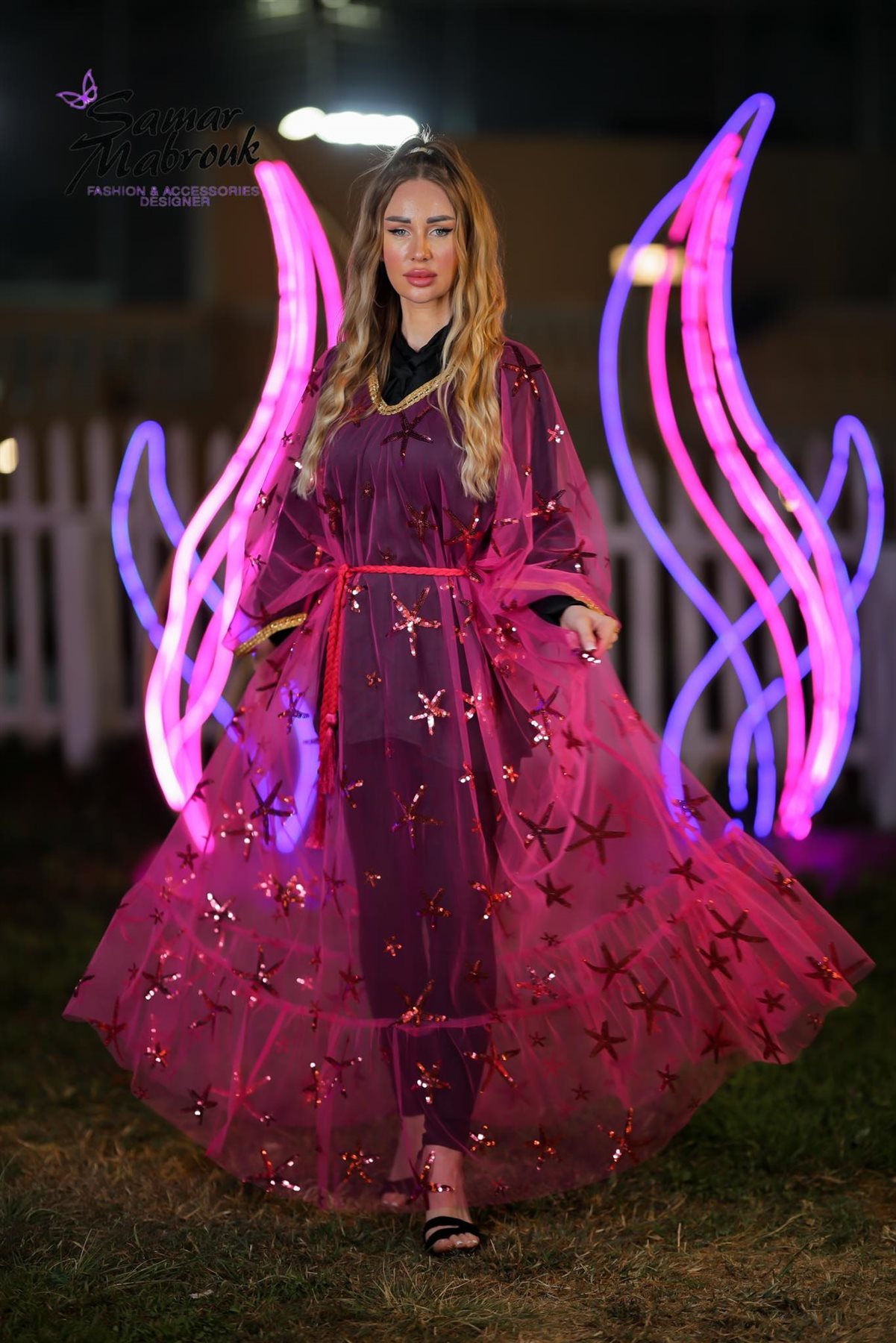 وعن الخامات المستخدمة، أشارت سمر، انها اسخدمت قماش هندي مطرز "هاندمايد بايت" و"سيرما دهبي" وقماش هندي مطرز هاندمايد خيوط وشراشيب حريرية.