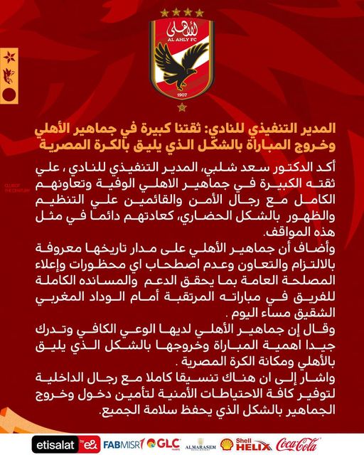سعد شلبي: ثقتنا كبيرة في ظهور جماهير الأهلي بشكل جيد