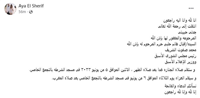 وتابعت آية الشريف قائلة: "وستقام صلاة الجنازة غدا بعد صلاه الظهر، الاثنين الموافق ٥ من يونيو ٢٠٢٣ فى مسجد الشرطة بالتجمع الخامس.