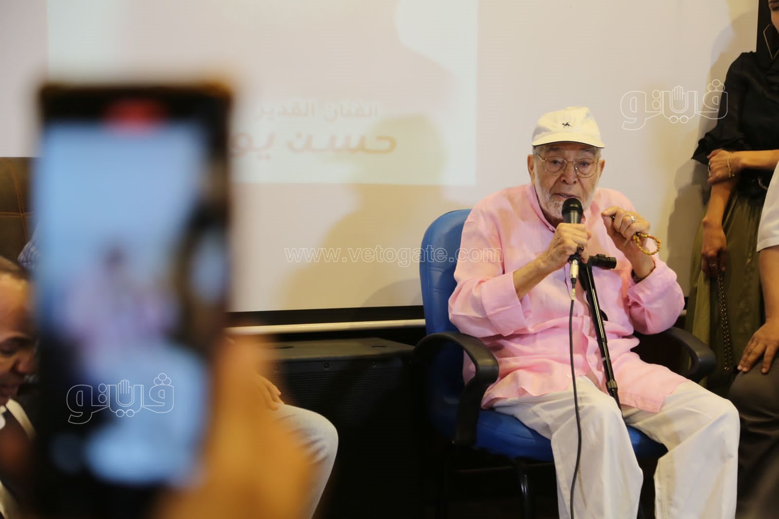 ومازح حسن يوسف الحضور في ندوة تكريمه التي أقيمت بقصر السينما قائلا: "أه طبعا.. أصل أبوه ياما باس مفيش حد متباسش فخليه يدوق".