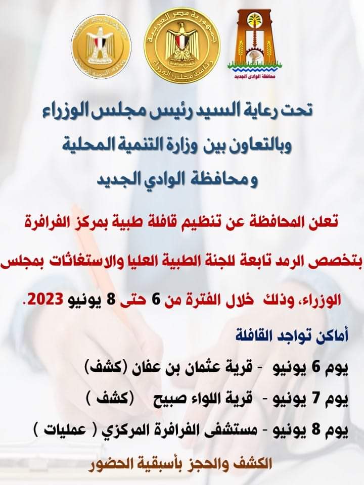 أعلنت محافظة الوادي الجديد، عن تنظيم قافلة طبية بمركز الفرافرة بتخصص الرمد تابعة للجنة الطبية العليا والاستغاثات بمجلس الوزراء، وذلك خلال الفترة من 6 حتى 8 يونيو 2023، وذلك تحت رعاية الدكتور مصطفى مدبولي رئيس مجلس الوزراء وبالتعاون بين وزارة التنمية المحلية ومحافظة الوادي الجديد.