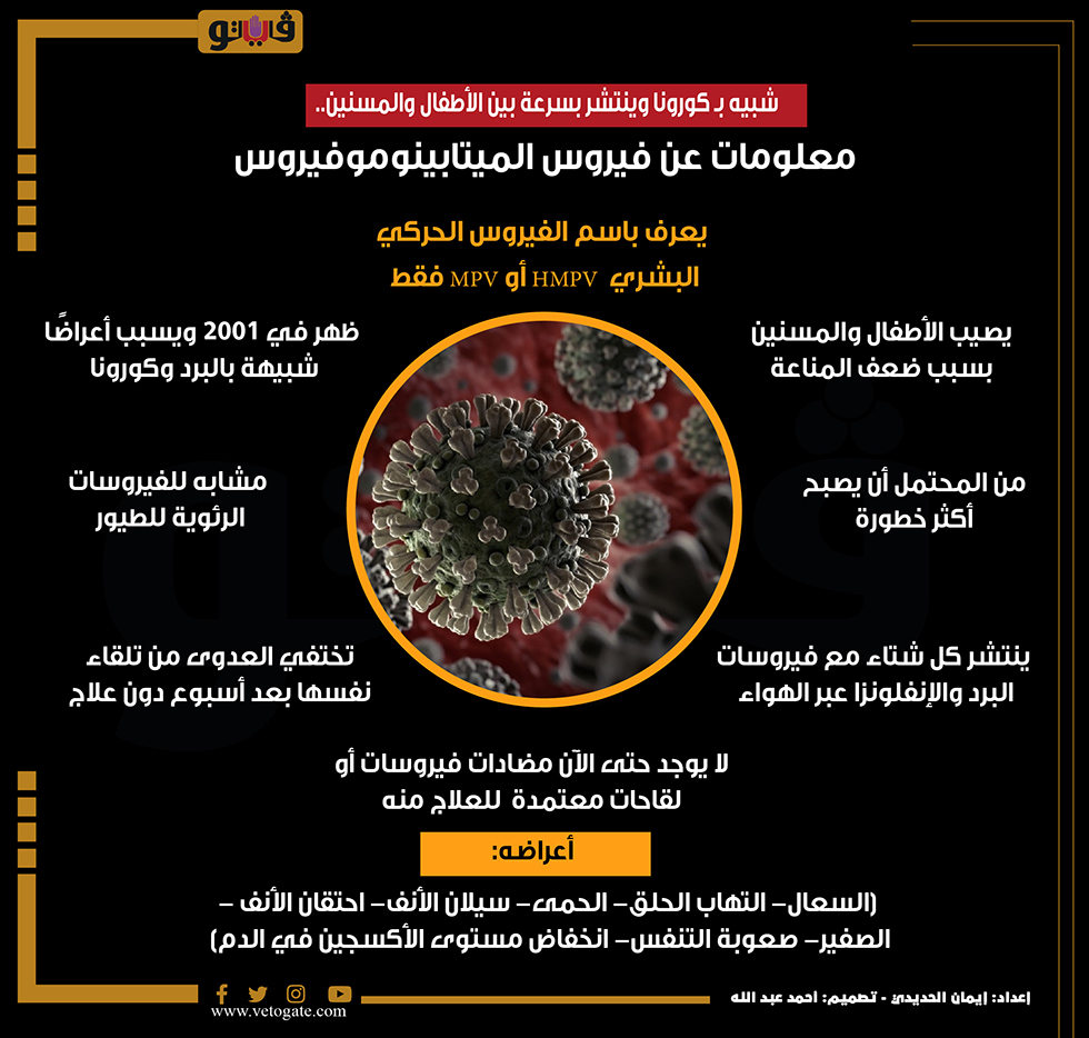 شبيه بـ كورونا وينتشر بسرعة بين الأطفال والمسنين.. معلومات عن فيروس الميتابينوموفيروس (انفوجراف) الإثنين 05/يونيو/2023 - 12:46 م 6/5/2023 12:46:15 PM فيروس جديد يشبه كورونا، فيتو إيمان الحديدى شارك طباعة 18 حجم الخط شارك طباعة الولايات المتحدة الولايات المتحده الامريكيه صعوبة التنفس سيلان الأنف كورونا فيروس