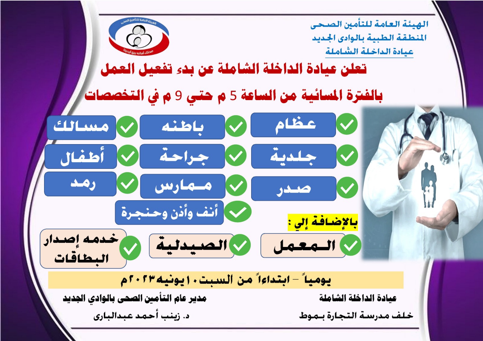 أعلنت عيادة الداخلة الشاملة والتابعة للتأمين الصحي بمحافظة الوادي الجديد، العمل بمنظومة العيادات المسائية، لتوقيع الكشف الطبي على العاملين بالهيئات الحكومية والمواطنين، وذلك يوميًا بدءا من السبت ١٠ يونيو الجاري من الساعة الخامسة عصرًا حتى التاسعة مساء، لتقديم خدمات صحية مميزة على مدار اليوم.