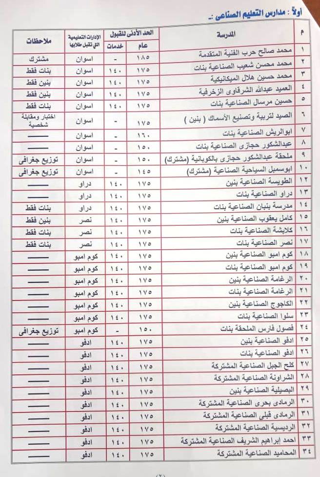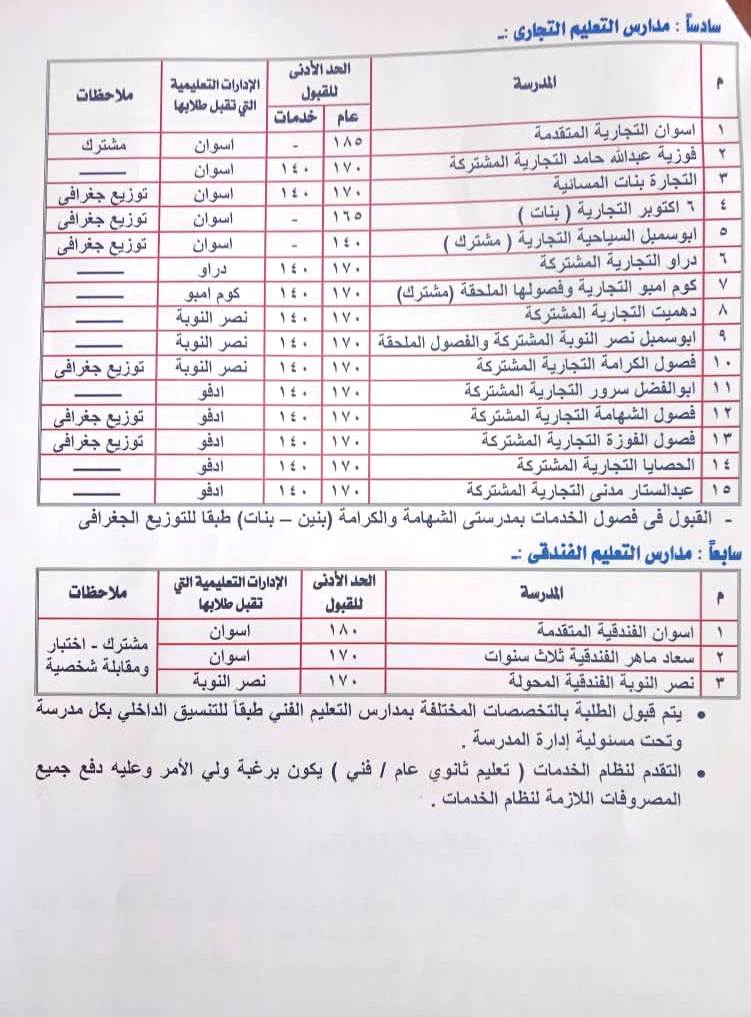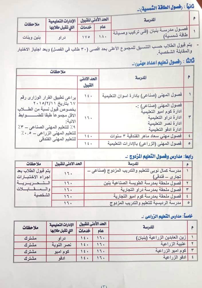 فيما سيكون الحد الأدنى للقبول بالثانوى العام ( الخاص ) 140 درجة، فى حين يتراوح الحد الأدنى للقبول بمدارس التعليم الفنى ( الصناعى والصيد لتربية وتصنيع الأسماك، والطاقة الشمسية، والزراعى والتجارى والفندقى )، وأيضًا الإعداد المهنى والتعليم والتدريب المزدوج ما بين 140 درجة إلى 185 درجة حسب نوعية المدرسة ونظام الدراسة بها.