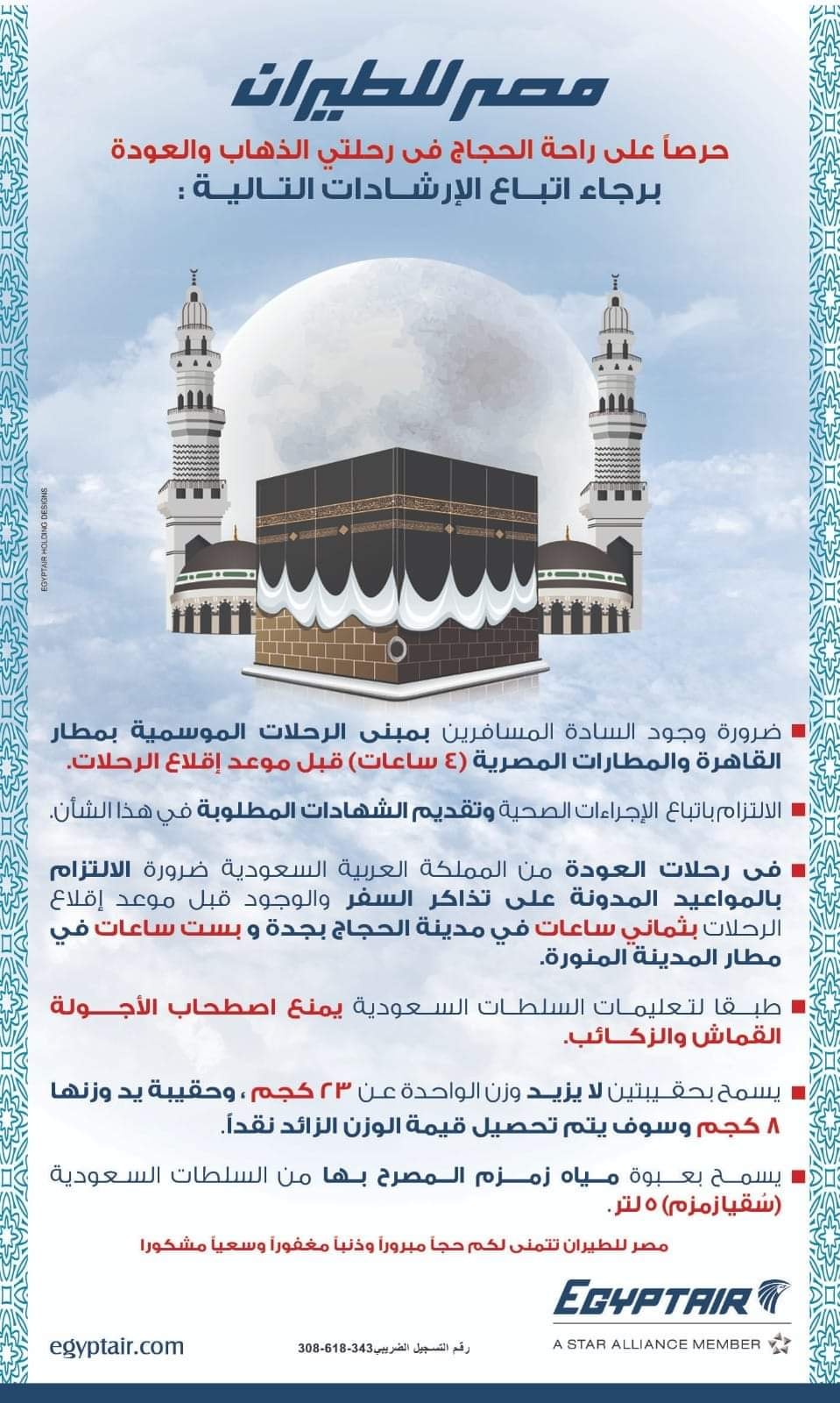 وتضمنت تعليمات الشركة الوطنية مصر للطيران للمسافرين لعمل مناسك الحج:
