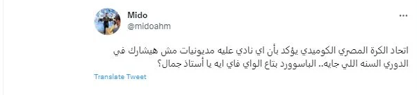 وقال ميدو في تغريدة نشرها قبل قليل على حسابه الشخصي على موقع تويتر: "اتحاد الكرة المصري الكوميدي يؤكد أن أي ناد عليه مديونيات مش هيشارك في الدوري السنة اللي جاية.. الباسوورد بتاع الواي فاي إيه يا أستاذ جمال؟.