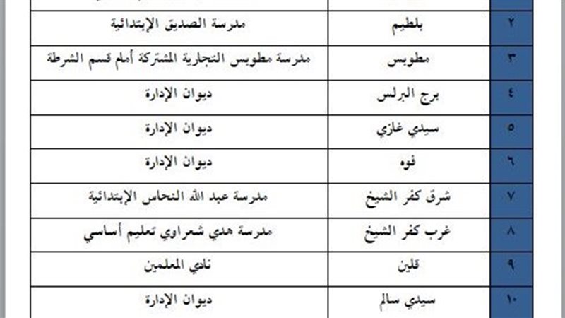 وأكد محمد عبدالله، وكيل الوزارة، أنه تم تحديد 13 موقعا ما بين مدرسة أو ديوان إدارة لاستقبال الطلاب وأولياء أمورهم، وهي مدرسة الدمرداش تعليم أساسي بإدارة الرياض، ومدرسة الصديق الابتدائية بادارة بلطيم، ومدرسة مطوبس التجارية المشاركة، بإدارة مطوبس،و ديوان إدارة برج البرلس، وديوان إدارة سيدي غازي، وديوان إدارة فوه، ومدرسة عبد الله النحاس الإبتدائية، بإدارة شرق كفر الشيخ، ومدرسة هدي شعراوي تعليم أساسي، بإدارة غرب، وديوان إدارة سيدى سالم، ومجمع الإشراف بإدارة دسوق، ومدرسية الحامول الابتدائية الجديدة، بإدارة الحامول، والمدرسة الإعدادية بنات الحديدة، خلف الإدارة التعليمية ببيلا.