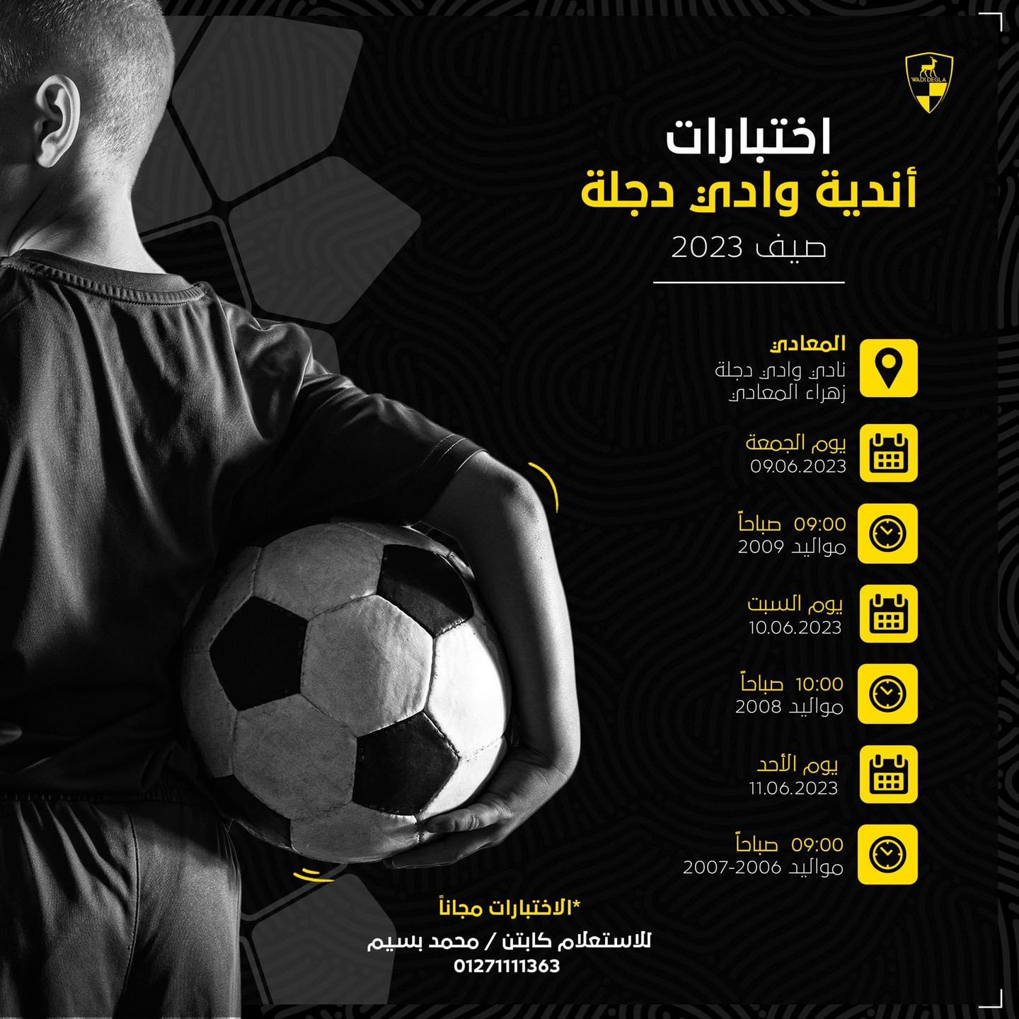 وتقام اختبارات نادي وادي دجلة - زهراء المعادي أيام الجمعة والسبت والأحد