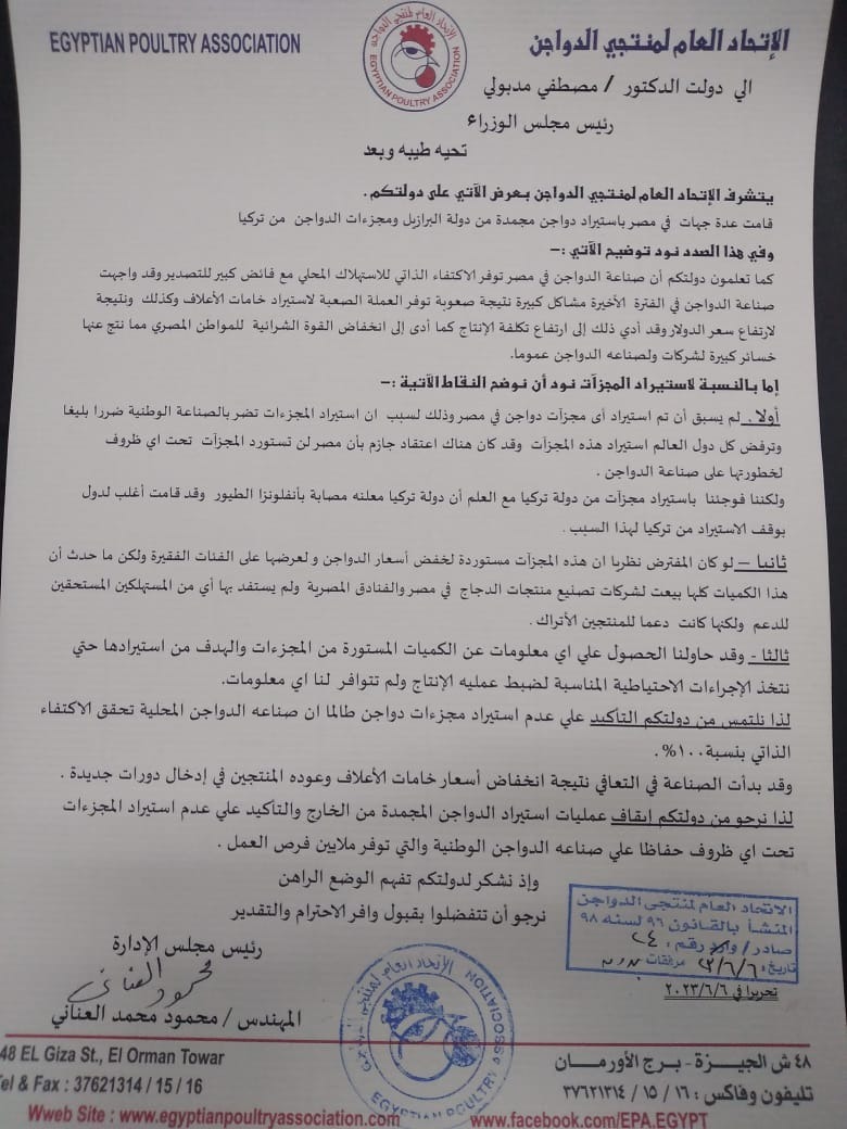وتضمن المذكرة المقدمة من اتحاد منتجي الدواجن أن صناعة الدواجن تكبدت خسائر كبيرة خلال الفترة الماضية بسبب أزمة نقص النقد الأجنبي والذي أثر سلبا على الشركات والمنتجين، وأن كان هناك اعتقاد جازم بإن مصر لن تستورد مجزأت الدواجن تحت أي ظروف لخطورتها على الصناعة، لكن فوجيء الاتحاد باستيراد مجزآت من دولة تركيا والمصنفة كدولة مصابة بإنفلونزا الطيور ولا تستورد دول العالم منها دواجن.