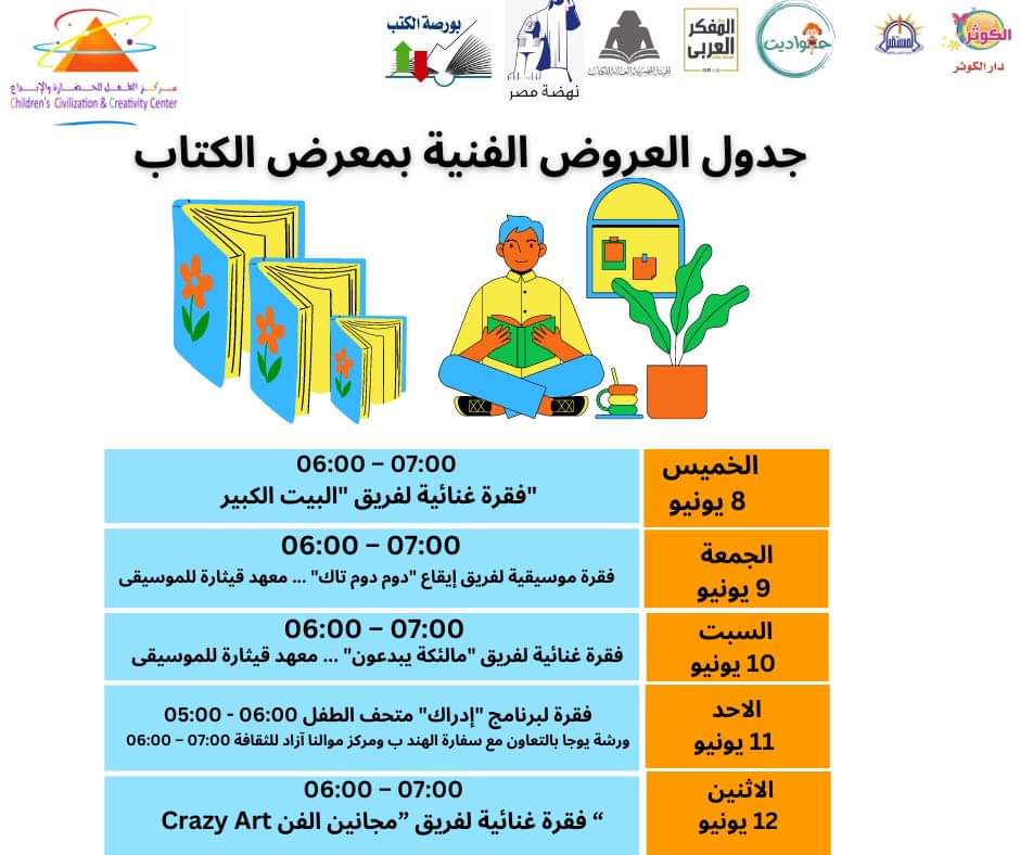 السبت 10 يونيو من الساعة 2 الى الساغة 6 ورشة المهارات السلوكية والاتيكيت للدكتورة سهام، ورشة حكي عن حديقة الحيوانات بالاضافة الى ورشة فنية تقدمها هاجر سالمة من متجر حواديت الالكتروني، وورشة فن تشكيلي حر الأطفال د. هدى مصطفى ورشة فنية Craft Paper أ. معتز عبد الفتاح