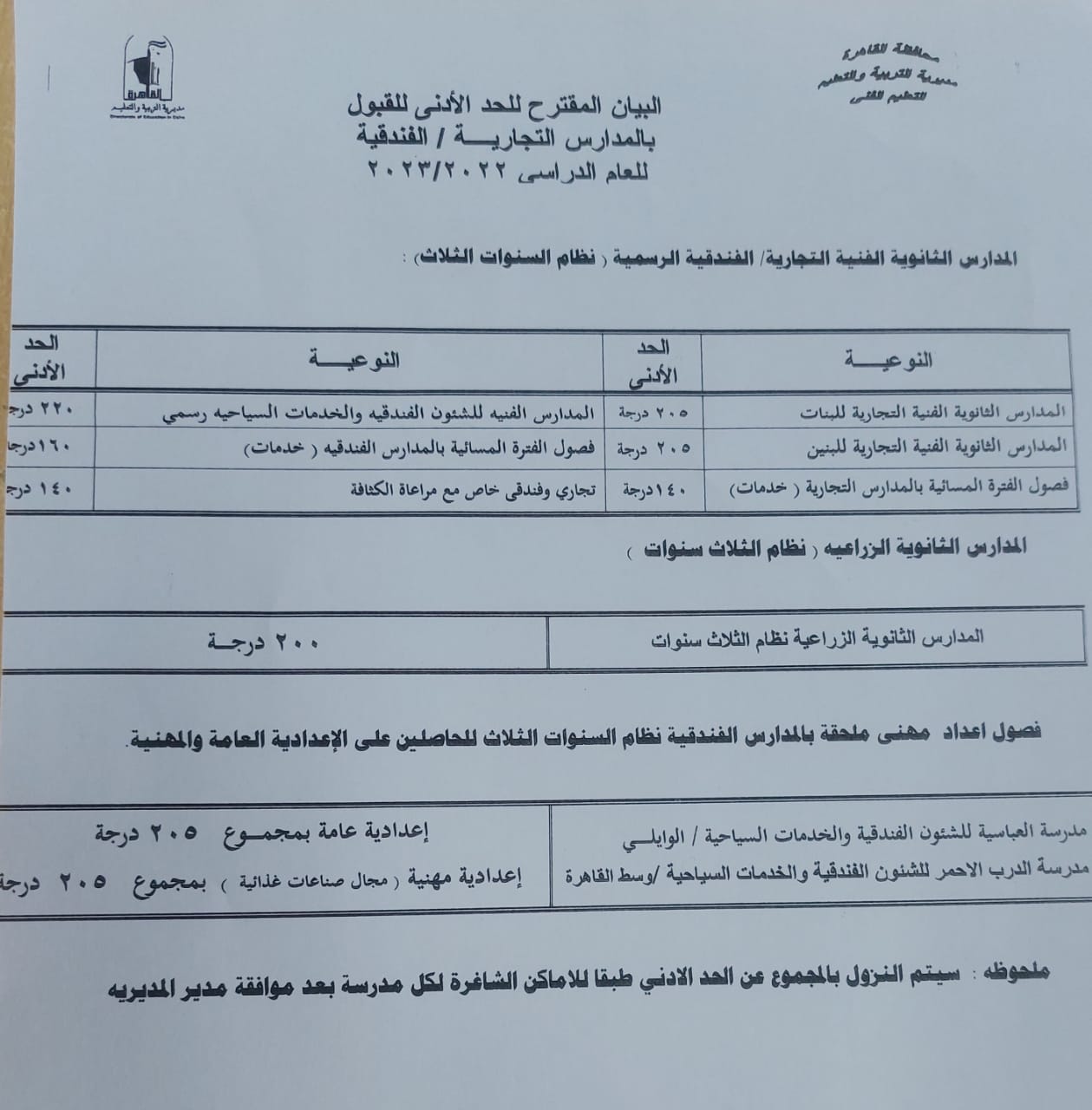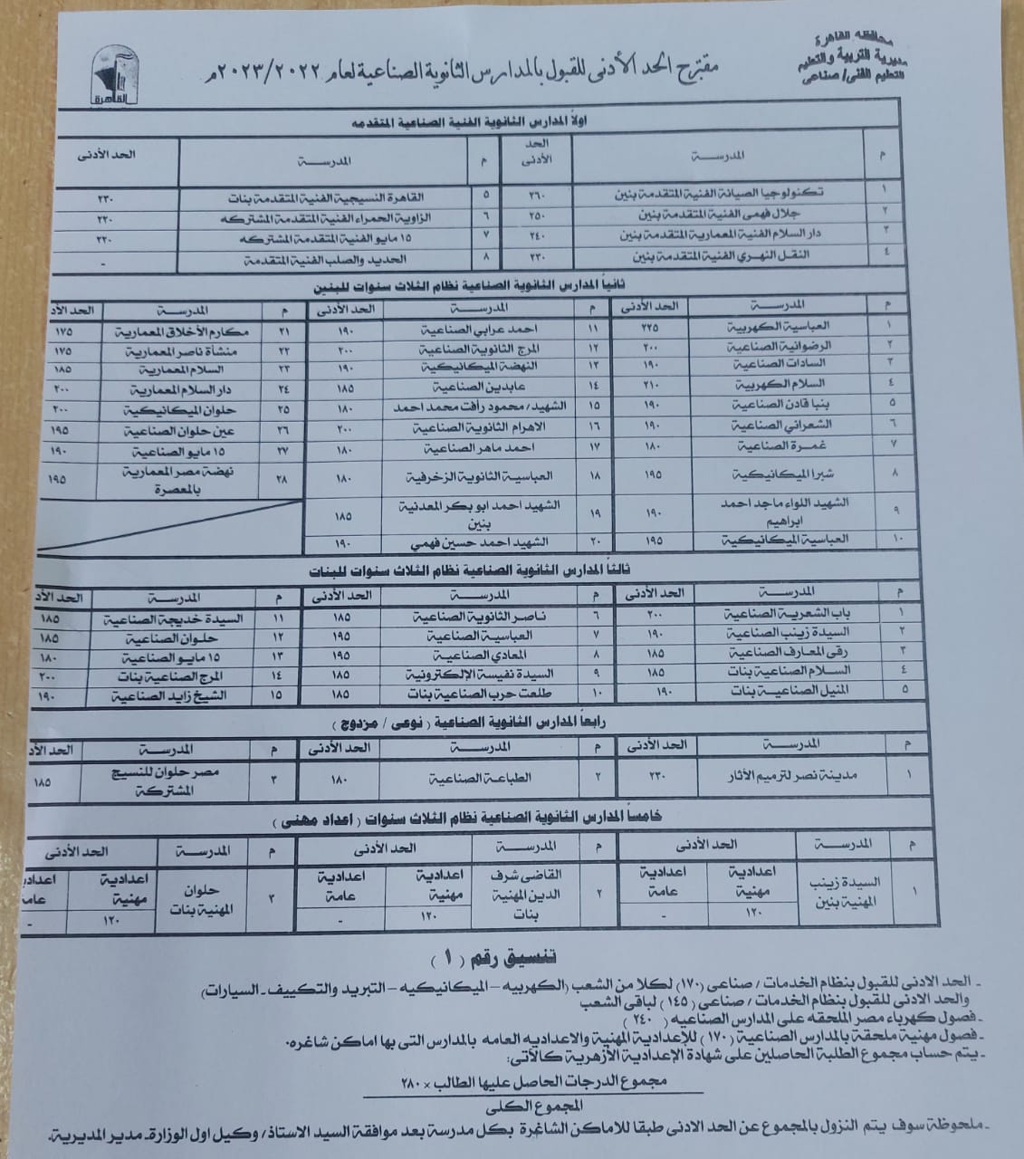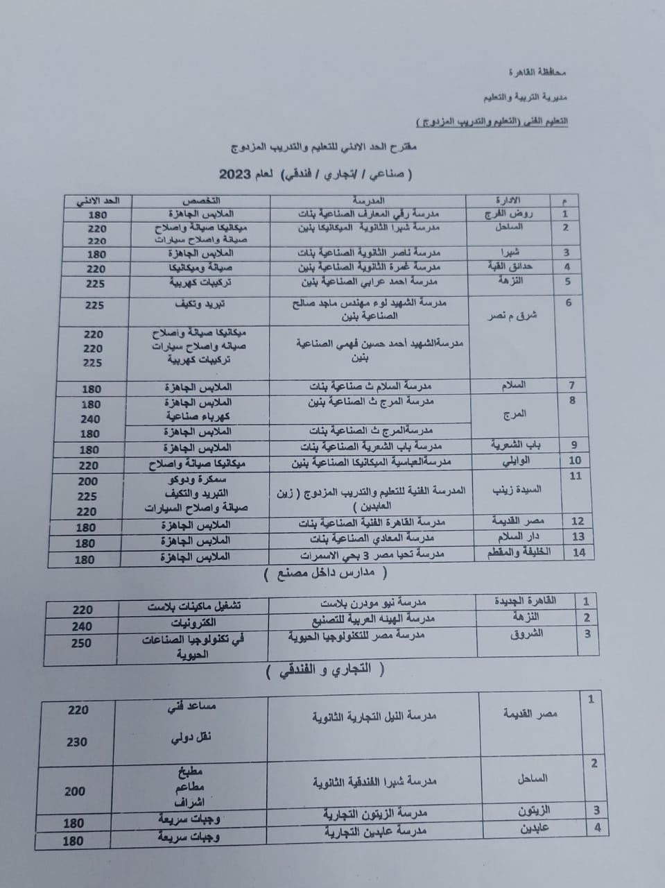 وجاء تنسيق القبول بالمدارس الثانوية الفنية ( الصناعية، التجارية، الفندقية، الزراعية، تعليم مزدوج) بـ محافظ القاهرة للعام الماضي 2022-2023 كالتالي: