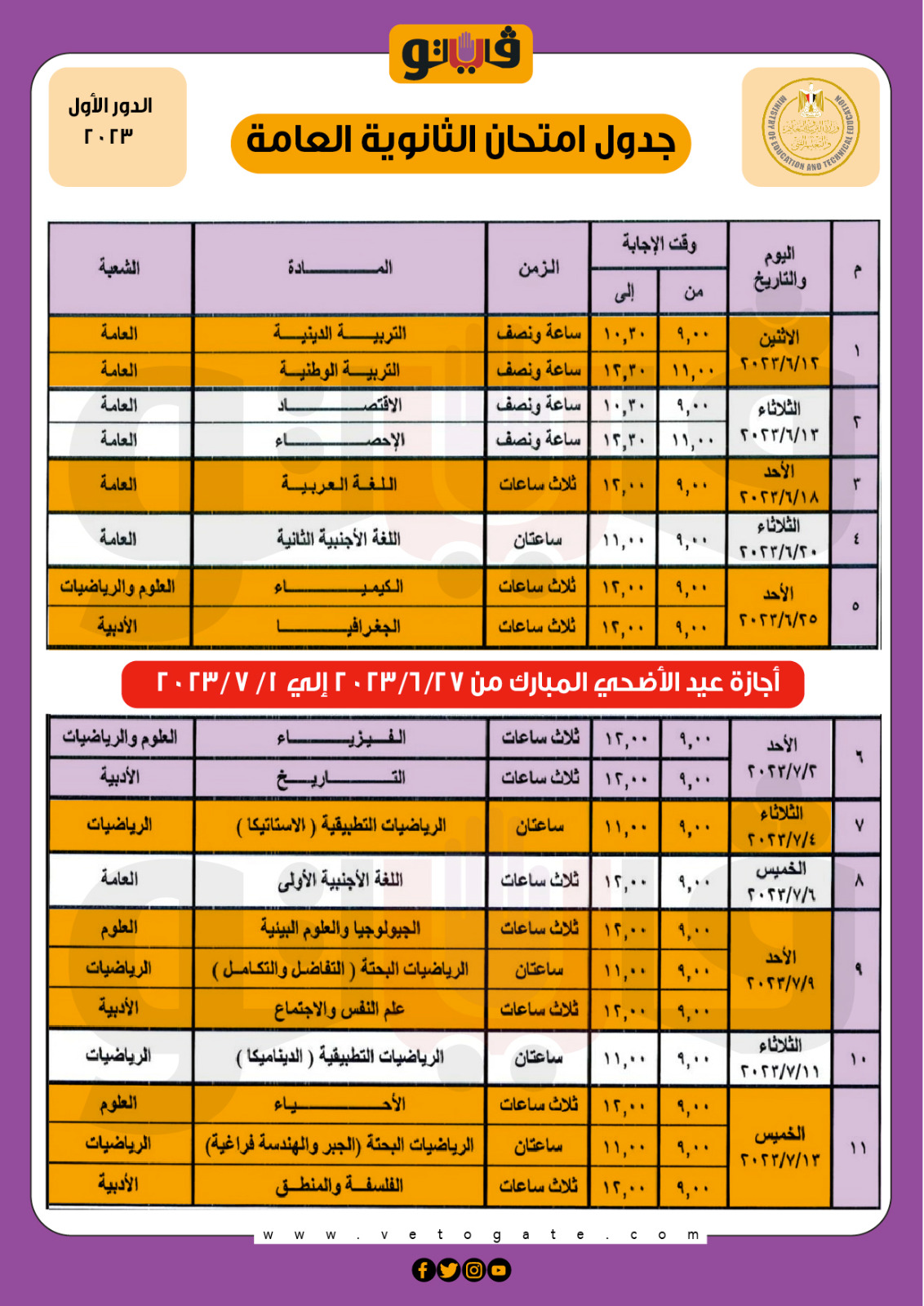 جدول امتحانات الثانوية العامة 2023