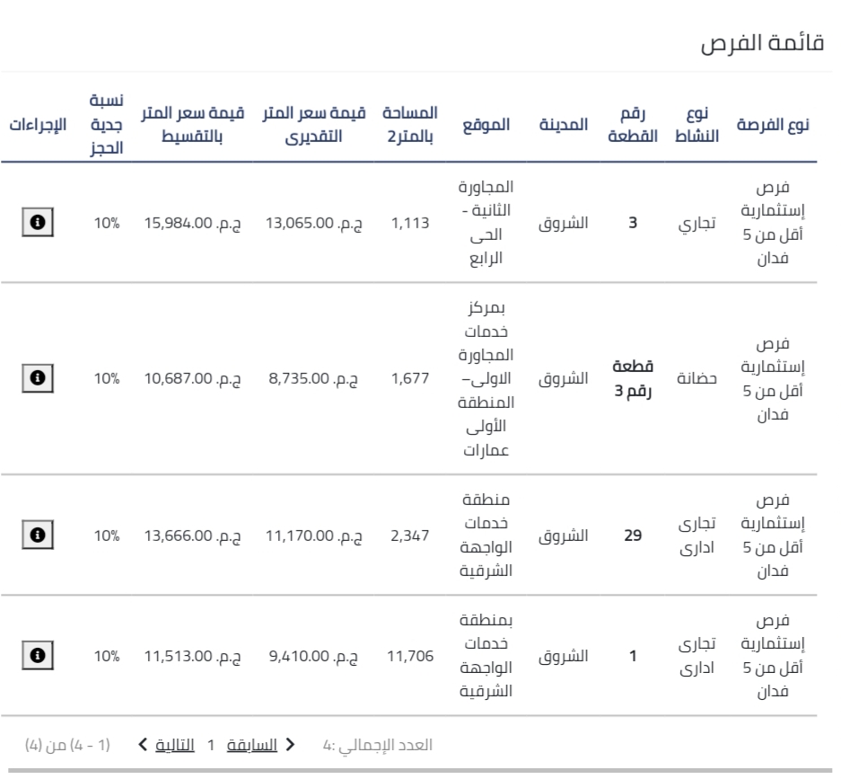 قطعة أرض رقم 3 بالمجاورة الثانية الحي الرابع بمساحة 1,113 متر مربع وسعرها التقديري 13,065.00 جنيه مصري للمتر مربع كاش، و15,984.00 جنيه مصري للمتر مربع تقسيط ونشاطها تجاري