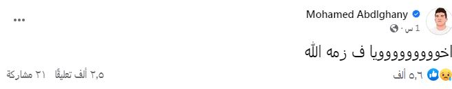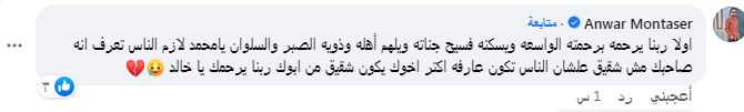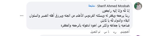 كما علق مقرب آخر من محمد عبد الغني يدعى شريف أحمد مصباح وكتب على “فيس بوك”: "إنا لله وإنا إليه راجعون، ربنا يرحمه ويغفر له ويسكنه الفردوس الأعلى من الجنة ويرزق أهله الصبر والسلوان البقاء والدوام لله يا كابتن.. صاحبه يا جماعة وأكتر من أخوه ادعوا له بالرحمة والمغفرة".