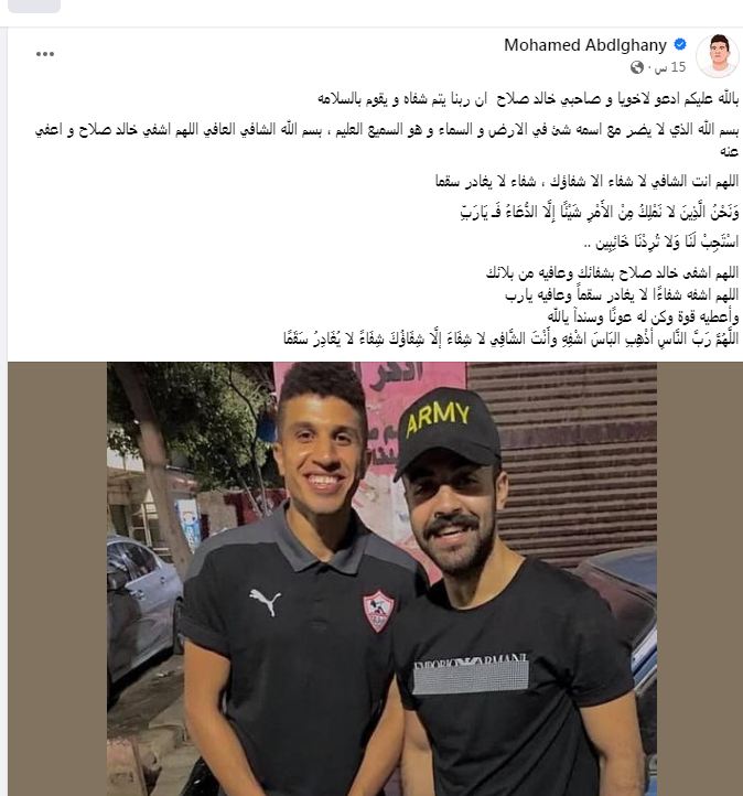 وأمس نشر محمد عبد الغني بوست يطالب فيه بالدعاء لصديقه وقال: "بالله عليكم ادعوا لأخويا وصاحبي خالد صلاح إن ربنا يتم شفاه ويقوم بالسلامة، بسم الله الذي لا يضر مع اسمه شيء في الأرض والسماء وهو السميع العليم، بسم الله الشافي العافي اللهم اشفي خالد صلاح واعفو عنه، اللهم أنت الشافي ﻻ شفاء إﻻ شفاؤك، شفاء ﻻ يغادر سقمًا، وَنَحْنُ الَّذِينَ لا نَمْلِكُ مِنْ الأَمْرِ شَيْئًا إِلَّا الدُّعَاءُ فَـ يَارَبِّ، اسْتَجِبْ لَنَا وَلا تُرِدْنَا خَائِبِين، اللهم اشفى خالد صلاح بشفائك وعافيه من بلائك، اللهم اشفه شفاءًا لا يغادر سقمًا وعافيه يا رب، وأعطيه قوة وكن له عونًا وسندًا يالله، اللَّهُمَّ رَبَّ النَّاسِ أذْهِبِ البَاسَ اشْفِهِ وأَنْتَ الشَّافِي لا شِفَاءَ إلَّا شِفَاؤُكَ شِفَاءً لا يُغَادِرُ سَقَمًا.