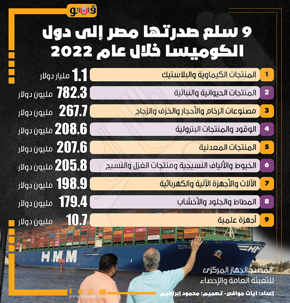 9 سلع صدرتها مصر إلى دول الكوميسا خلال عام 2022 (إنفوجراف) الخميس 08/يونيو/2023 - 12:24 م 6/8/2023 12:24:16 PM صورة أرشيفية آيات الموافى شارك طباعة 18 حجم الخط شارك طباعة والبلاستيك الجهاز المركزى للتعبئة العامة والإحصاء والزجاج الكوميسا صادرات مصر لدول الكوميسا الوقود والمنتجات البترولية