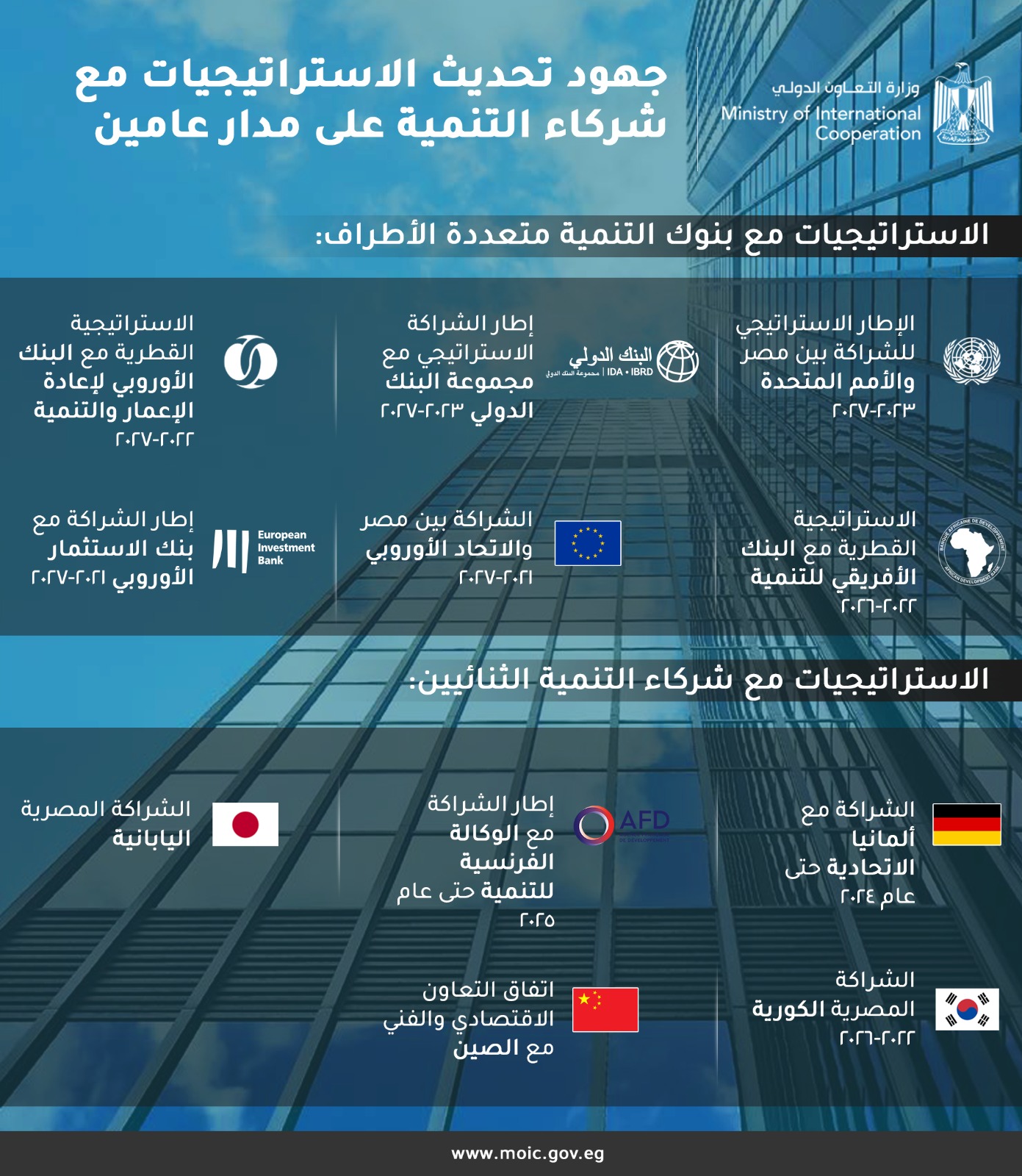 وكانت وزارة التعاون الدولي، على مدار العامين الماضيين قد قادت عملية مشاورات موسعة مع كافة المؤسسات متعددة الأطراف لتحديث الاستراتيجيات للخمس سنوات المقبلة، بالتعاون مع الجهات الوطنية المعنية، ليتم تحديث الاستراتيجيات مع البنك الأوروبي لإعادة الإعمار والتنمية، وبنك التنمية الأفريقي، ومجموعة البنك الدولي، والأمم المتحدة، والاتحاد الأوروبي وبنك الاستثمار الأوروبي، إلى جانب تحديث الاستراتيجيات مع شركاء التنمية الثنائيين من بينها الشراكة مع ألمانيا الاتحادية حتى عام 2024، وإطار الشراكة مع الوكالة الفرنسية للتنمية حتى عام 2025، والشراكة المصرية اليابانية، والشراكة المصرية الكورية 2022-2026، واتفاق التعاون الاقتصادي والفني مع الصين.