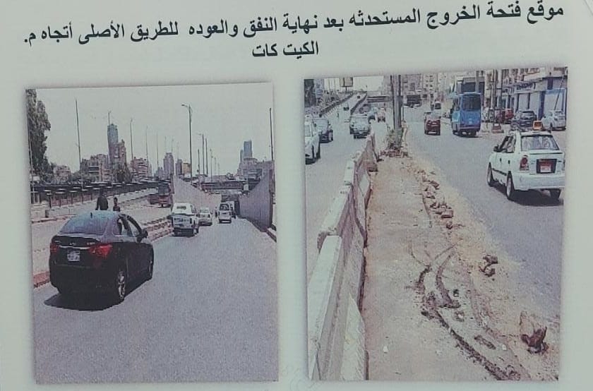 - استكمال سير المركبات داخل نفق العجوزة اتجاه ميدان الكيت كات ثم العودة مره أخرى للاتجاه الأصلي بشارع كورنيش النيل بعد الخروج من النفق عن طريق فتحة خروج للمركبات تم إستحداثها بالجزيرة الوسطى بشارع كورنيش النيل فى المنطقة المواجهة لشركة مياه الشرب والصرف الصحى بالجيزة قبل ميدان الكيت كات بمسافه مناسبه.