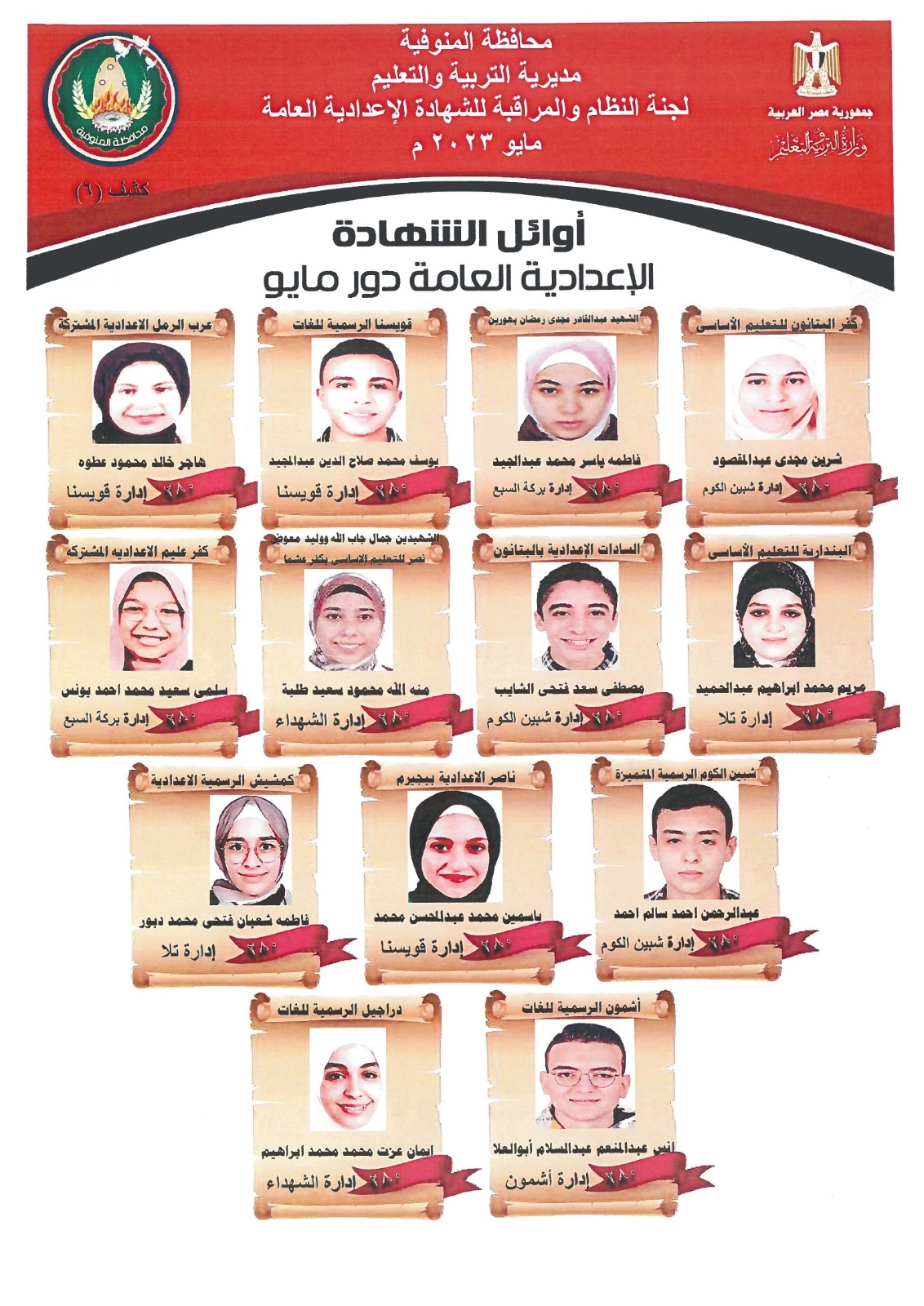 بالأسماء، قائمة أوائل الشهادة الإعدادية بالمنوفية