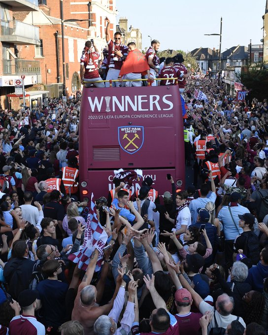 احتفل لاعبو فريق وست هام يونايتد الإنجليزي بلقب دوري المؤتمر الأوروبي بحافلة مكشوفة وسط المدينة مع جماهير الفريق التي حضرت بكثافة للاحتفال باللقب.