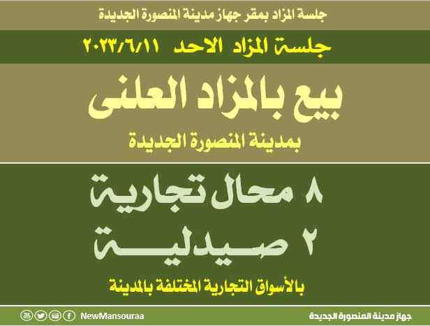 مزاد علني، كشف جهاز مدينة المنصورة الجديدة عن طرح 8 محال تجارية و2 صيدلية في مزاد علني بالأسواق المختلفة بالمدينة.