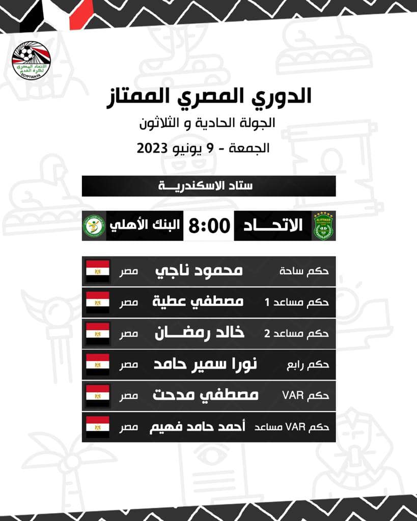 الدوري المصري، أعلنت لجنة الحكام بالاتحاد المصري لكرة القدم طاقم تحكيم مباراة الاتحاد السكندري والبنك الأهلي المقرر إقامتها اليوم الجمعة ببطولة الدوري الممتاز.