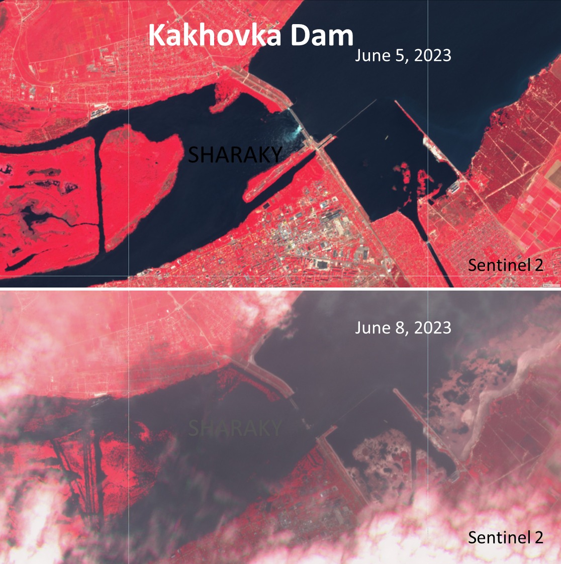 سد كاخوفكا، نشر الدكتور عباس شراقي، أستاذ الموارد المائية والجيولوجيا بجامعة القاهرة صورًا لـ سد كاخوفكا بالأقمار الصناعية قبل وبعد التدمير.
