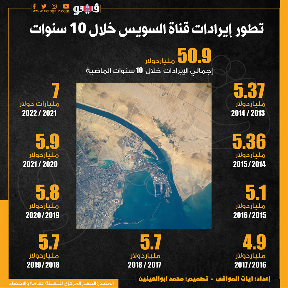 تطور إيرادات قناة السويس خلال 10 سنوات (إنفوجراف) الجمعة 09/يونيو/2023 - 02:35 م 6/9/2023 2:35:59 PM قناة السويس، فيتو آيات الموافى شارك طباعة 18 حجم الخط شارك طباعة السويس قناة السويس ليار دولار
