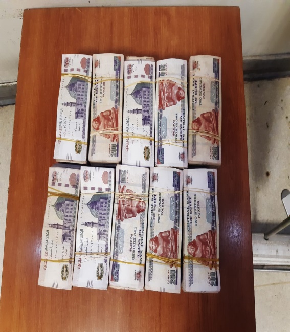وضبط (سيدة- مقيمة بمحافظة الدقهلية) لحيازتها (مبلغ مالى"عملات محلية") كانت مخبأة بحقيبتها بالمخالفة للقانون، وذلك حال إنهاء إجراءات مغادرتها البلاد