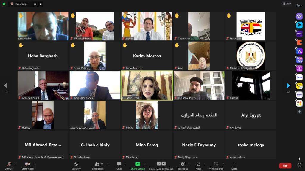 ضمن مبادرة "ساعة مع الوزيرة"، عقدت السفيرة سها جندي وزيرة الدولة للهجرة وشئون المصريين بالخارج، لقاء افتراضيا عبر الفيديو كونفرانس، مع 45 مصريا من رموز الجالية المصرية في جمهورية أيرلندا واسكتلندا وأيرلندا الشمالية، لمناقشة أوضاع الجالية والاستماع إلى أفكارهم وأطروحاتهم الخاصة بخلق مزيد من الربط بين أعضاء الجالية ووطنهم مصر خلال الفترة المقبلة، بما يلبي احتياجات المصريين في هذه الدول، وذلك بحضور السفير عمرو عباس مساعد وزيرة الهجرة لشئون الجاليات، والسفير محمد ثروت سليم، سفير مصر في أيرلندا، السفير محمد أبو الخير قنصل عام مصر في لندن.