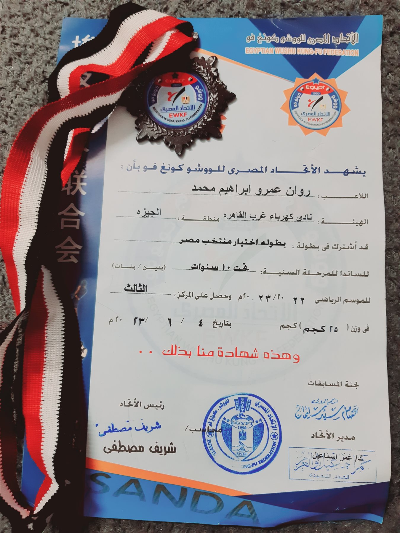 حصلت اللاعبة روان عمرو إبراهيم، لاعبة نادي كهرباء غرب القاهرة، على المركز الثالث في بطولة تجارب منتخب مصر للووشوو كونج فو مرحله تحت ١٠ سنوات بنات.