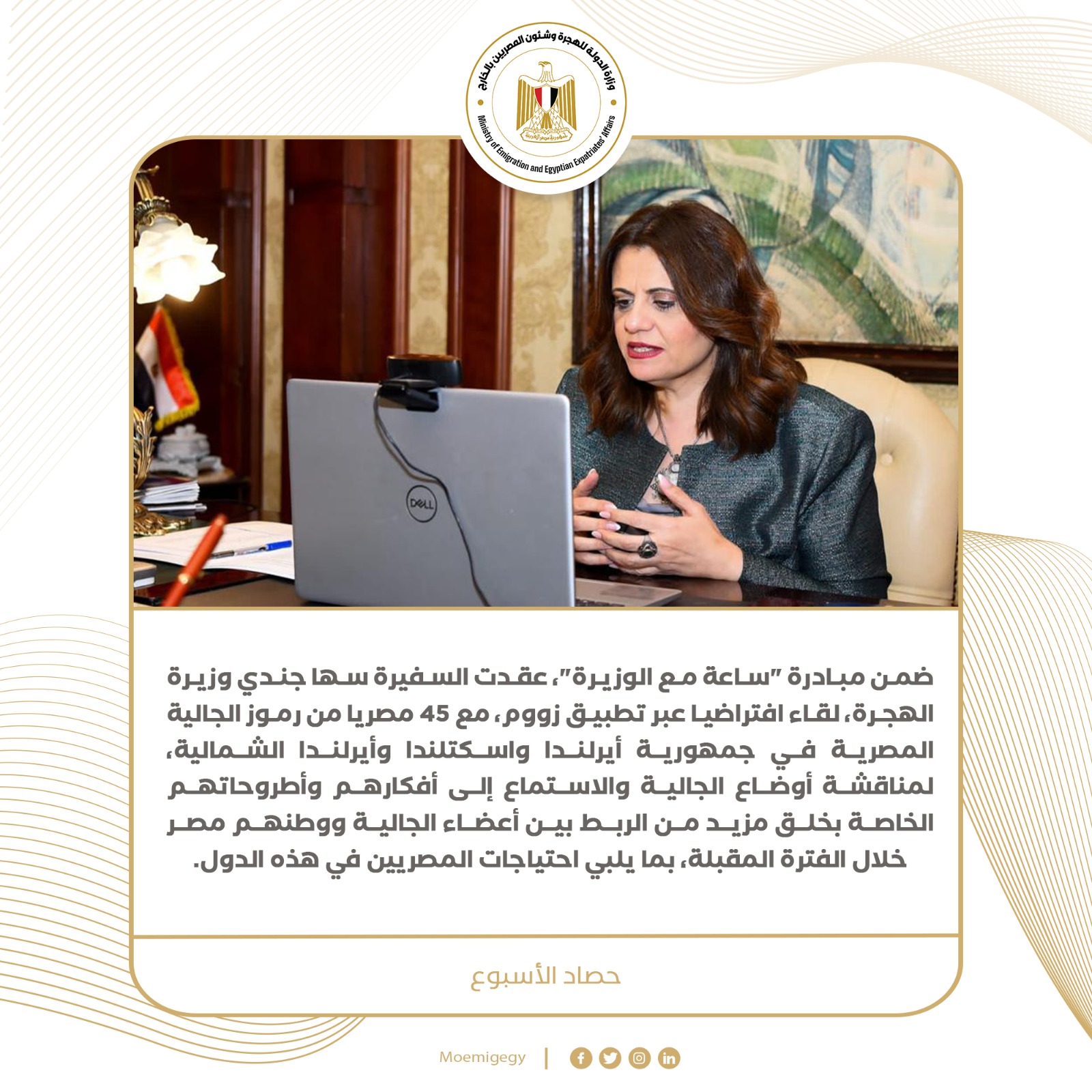 وضمن مبادرة "ساعة مع الوزيرة"، عقدت السفيرة سها جندي وزيرة الهجرة، لقاء افتراضيا عبر تطبيق زووم، مع 45 مصريا من رموز الجالية المصرية في جمهورية أيرلندا واسكتلندا وأيرلندا الشمالية، لمناقشة أوضاع الجالية والاستماع إلى أفكارهم وأطروحاتهم الخاصة بخلق مزيد من الربط بين أعضاء الجالية ووطنهم مصر خلال الفترة المقبلة، بما يلبي احتياجات المصريين في هذه الدول. وقد أكدت السفيرة سها جندي أن الوزارة بالفعل تكرم أبنائنا المتفوقين بالخارج، وسيتم العمل على زيادة الجهود لتسليط الضوء بشكل أكبر عن النماذج الناجحة للمصريين بالخارج، كما أنها ستناقش مع السيد وزير الطيران المدني إمكانية وجود خط طيران مباشر بين أدنبرا عاصمة اسكتلندا للقاهرة للتسهيل على مواطنينا هناك، علاوة على التنسيق لإقامة أندية اجتماعية تسهل تعارف المصريين بالخارج على بعضهم البعض، معربة عن شكرها للمصريين بالخارج لحرصهم على الترويج لجهود الدولة المصرية بالخارج.