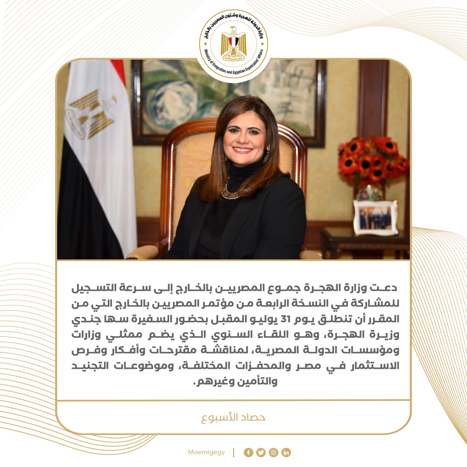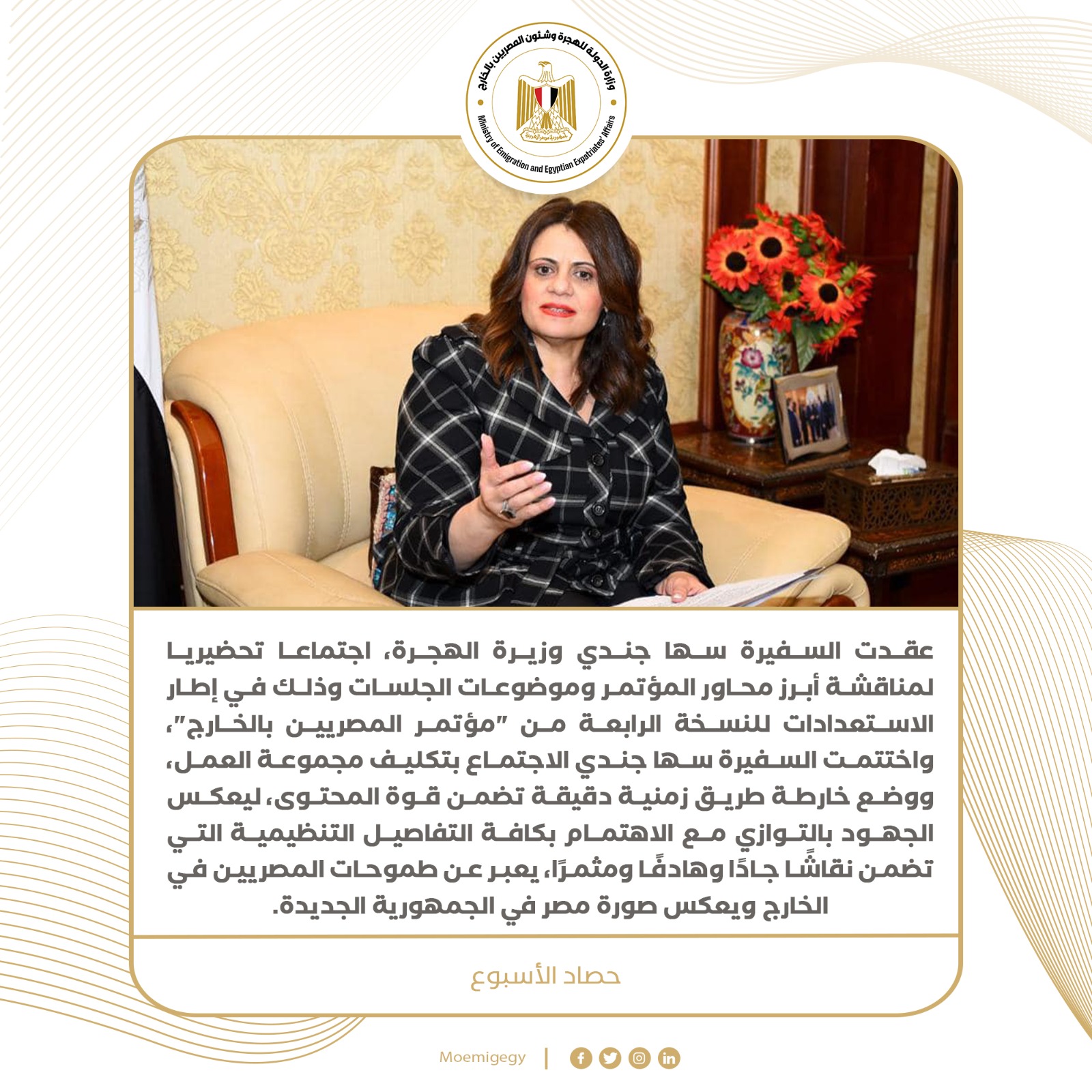 نشرت وزارة الدولة للهجرة وشئون المصريين بالخارج، تقريرًا تسلط من خلاله الضوء على نشاط هذا الأسبوع للسفيرة سها جندي وزيرة الهجرة، وذلك خلال الفترة من 3 يونيو إلى 10 يونيو الجاري وهو كالآتي: