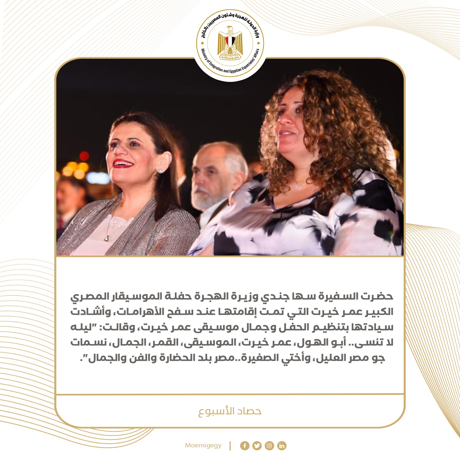 وحضرت السفيرة سها جندي وزيرة الهجرة حفلة الموسيقار المصري الكبير عمر خيرت التي تمت إقامتها عند سفح الأهرامات، وأشادت سيادتها بتنظيم الحفل وجمال موسيقى عمر خيرت، وقالت: "ليله لا تنسى.. أبو الهول، عمر خيرت، الموسيقى، القمر، الجمال، نسمات جو مصر العليل، وأختي الصغيرة..مصر بلد الحضارة والفن والجمال".